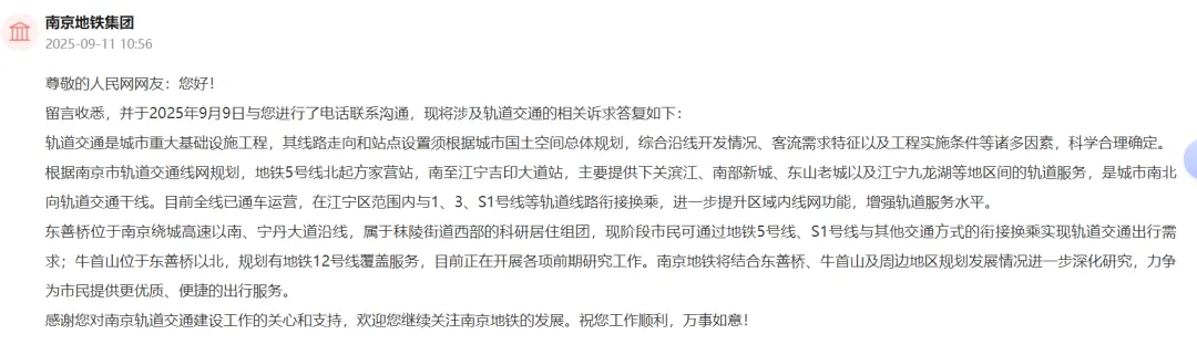 该网友说道:“江苏软件园、东善桥片区,居住工作人口数量巨大,希望地铁5号线,能从吉印大道再向南延伸2站,这能极大改善东善桥片区的出行!”就在8月20日,南京地铁集团给出正式答复,并没有直接否认,而是表示将结合江苏软件园及周边地区规划发展情况进一步深化研究,也就是说,未来5号线也不是没有南延的可能性。轨道交通是城市重大基础设施工程,其线路走向和站点设置须根据城市国土空间总体规划,综合沿线开发情况、客流需求特征以及工程实施条件等诸多因素,科学合理确定。根据轨道交通线网规划,地铁5号线北起方家营站,南至江宁吉印大道站,主要提供下关滨江、南部新城、东山老城以及江宁九龙湖等地区间的轨道服务,是城市南北向轨道交通干线。目前全线已通车运营,并在江宁区范围内与1、3、S1号线等轨道线路衔接换乘,进一步提升线网功能,增强区域内轨道服务水平。