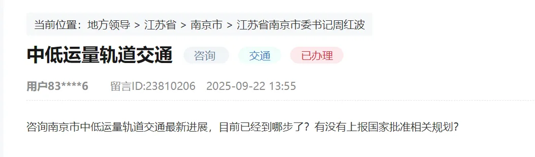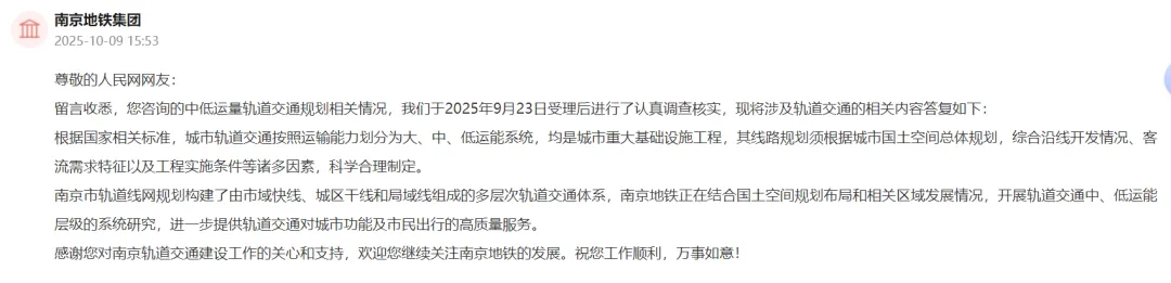 也有网友咨询南京中运量轨道交通进展,目前已经到哪步了,有没有上报国家批准?根据国家相关标准,城市轨道交通按照运输能力划分为大,中,低运能系统,均是城市重大基础设施工程,其线路规划须根据城市国土空间总体规划,综合沿线开发情况,客流需求特征以及工程实施条件等诸多因素,科学合理制定。南京市轨道线网规划构建了由市域快线,城区干线和局域线组成的多层次轨道交通体系,南京地铁正在结合国土空间规划布局和相关区域发展情况,开展轨道交通中,低运能层级的系统研究,进一步提供轨道交通对城市功能及市民出行的高质量服务。感谢您对南京轨道交通建设工作的关心和支持,欢迎您继续关注南京地铁的发展。祝您工作顺利,万事如意!