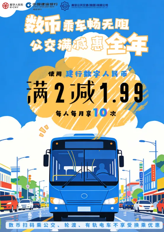 即日起,只要您使用建设银行数字人民币个人钱包付款码扫码乘坐南京公交集团的公交/轮渡/有轨电车,就能享受乘车立减优惠,让您的出行更轻松、更划算!