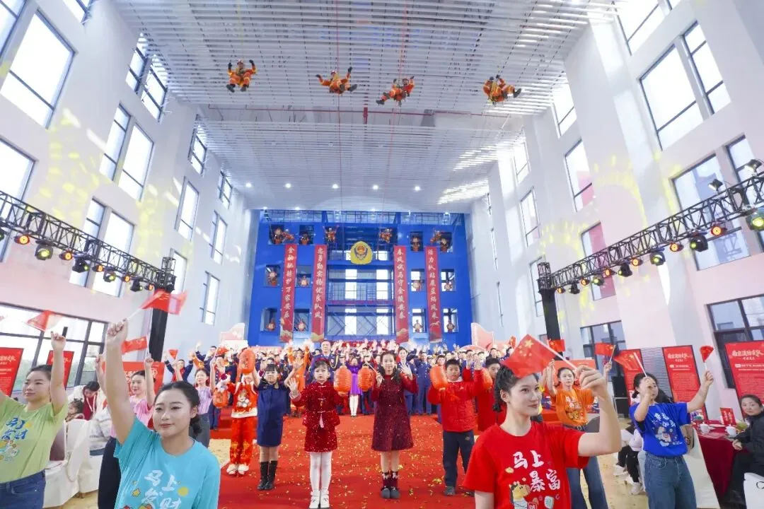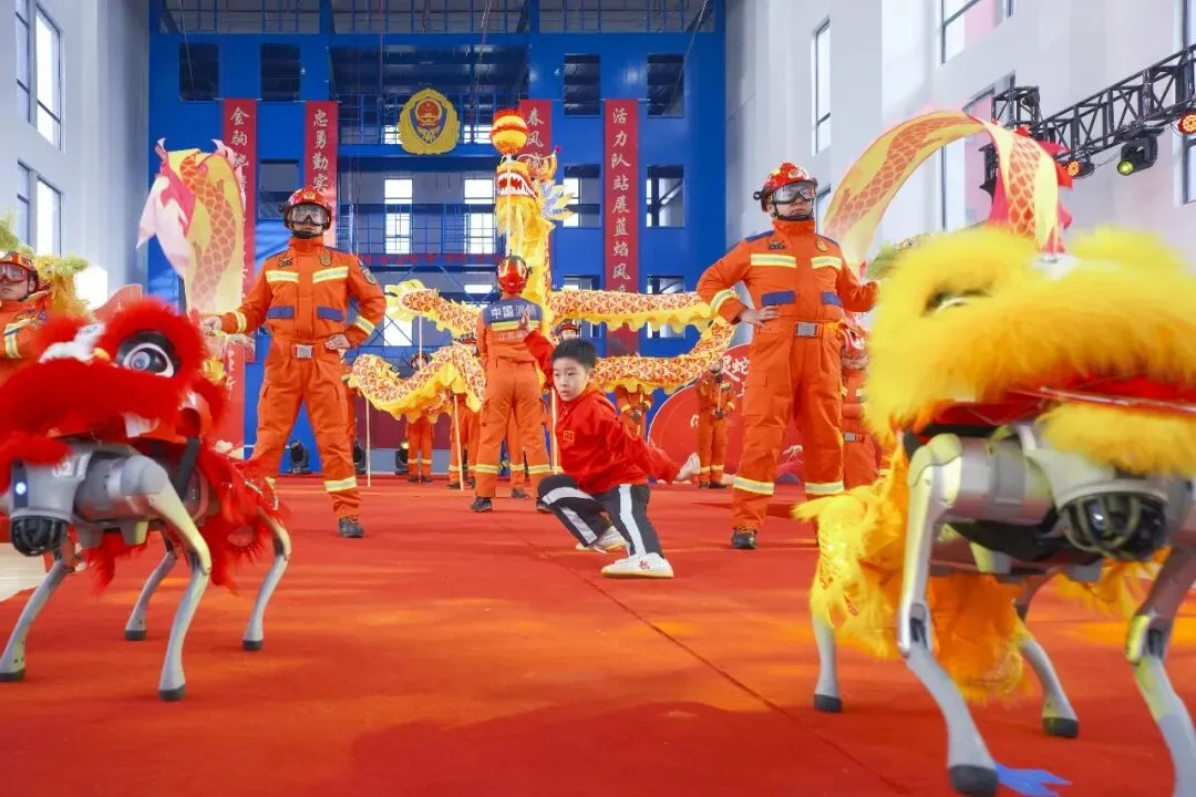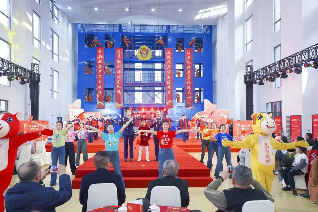 大鼓铿锵震撼开场,舞龙彩带翻腾似浪,手狮空竹交相辉映,身着新春装束的机器狗与机器人惊喜亮相,指战员家属“武力”全开,生动展现“一队一特色”建设成果。