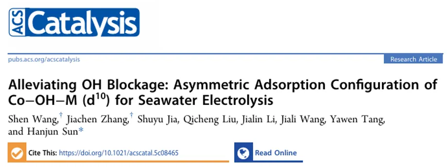 钴基磷化物、硫化物和硒化物等材料(Co-Xides, X=P、S、Se)是极具潜力的耐腐蚀海水电解阳极催化剂,这源于其在反应过程中原位重构形成的含氧阴离子层(如PO43-、SO42-、SeO42-)能通过静电排斥作用有效抑制氯离子吸附。然而,在重构形成的OER活性相CoOOH中,关键氧中间体OH通过对称的d-p-d轨道构型Co-OH-Co被过度稳定在活性位点上,导致活性位点堵塞,显著抬升了后续OER步骤的能垒。基于此,本文通过引入具有d10构型的元素(In,Sn,Sb)成功构建了不对称的d-p-p轨道构型Co-OH-M(d10)。该结构利用轨道能级与对称性上的失配效应,显著降低了催化剂表面的OH覆盖度并促进了活性位点的循环再生。得益于此,具有代表性的Sn-CoOOH-PO43-催化剂分别在模拟海水和碱性天然海水中,于750 mA cm-2(1.78 V)和500 mA cm-2(2.05 V)的电流密度下分别稳定运行1000 h和500 h,展现出了出色的活性与耐久性。综上,本工作突破了耐氯腐蚀与高效析氧之间的传统权衡关系,为设计高效的海水电解催化剂提供了一个新的思路。