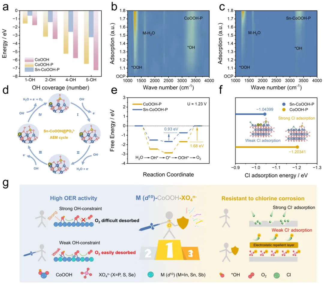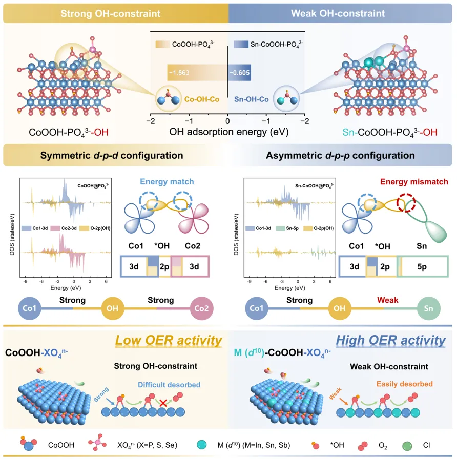 本文通过在Co-Xides(X=P、S、Se)中引入d10构型元素(In,Sn,Sb),利用电化学氧化条件下驱动的原位重构过程,成功构建了M(d10)-CoOOH-XO4n-催化剂。理论计算与实验共同表明,所形成的不对称d-p-p构型(Co-OH-M(d10))能够有效削弱原有d-p-d构型(Co-OH-Co)对OH中间体的强束缚作用,从而缓解OH堵塞问题与活性位点的再生,显著提升了OER反应动力学。基于此策略制备的代表性催化剂Sn-CoOOH-P,在海水电解中表现出优异的催化活性和催化稳定性。本工作成功突破了传统催化剂在耐氯腐蚀性与高OER活性之间的权衡问题,为设计高效海水电解催化剂提供了新的思路与重要参考。