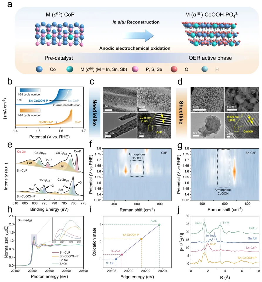 基于上述对催化剂设计思路的理论预测,为了从实验上去验证该设计思路的可行性,本研究通过简单的水热、磷化以及电化学氧化条件下驱动的原位重构三个步骤成功制备了Sn-CoOOH-P催化剂。通过对比重构前后催化剂的形貌变化(针状转变为片状)结合XPS与原位Raman分析证实了OER活性相CoOOH的形成。XAS图谱分析表明,Sn在Sn-CoP与Sn-CoOOH-P中的配位环境分别为Sn-P配位与Sn-O配位,且均未观察到对应于Sn-Sn金属键与Sn-O(SnO2)金属键的特征峰,证明Sn在重构前后均是以替代部分Co位点的形式存在,这为不对称吸附构型Co-OH-M(d10)的形成提供了实验上的证据。