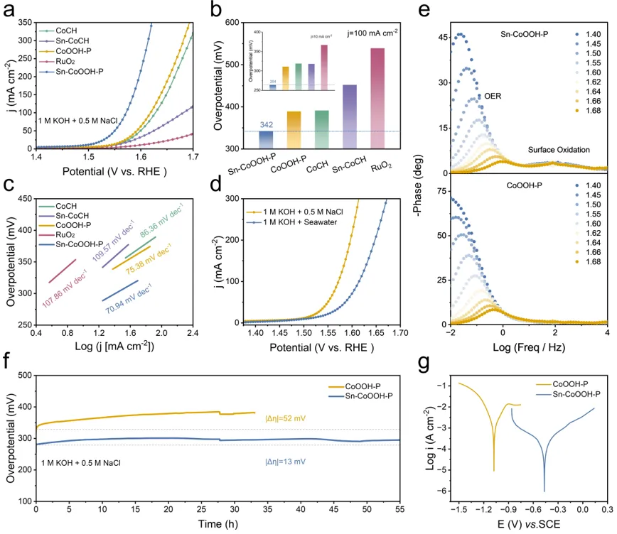 随后采用标准的三电极体系对所设计的催化剂进行了一个初步的电化学性能探究。得益于d10构型Sn的引入,所设计的催化剂在模拟海水中表现出优异的OER活性,仅需264 mV与342 mV的过电位即可达到10 mA cm-2与100 mA cm-2的电流密度。更为重要的是,Sn-CoOOH-P在10 mA cm-2的电流密度下,在模拟海水中稳定运行55 h,展现出了出色的催化稳定性。