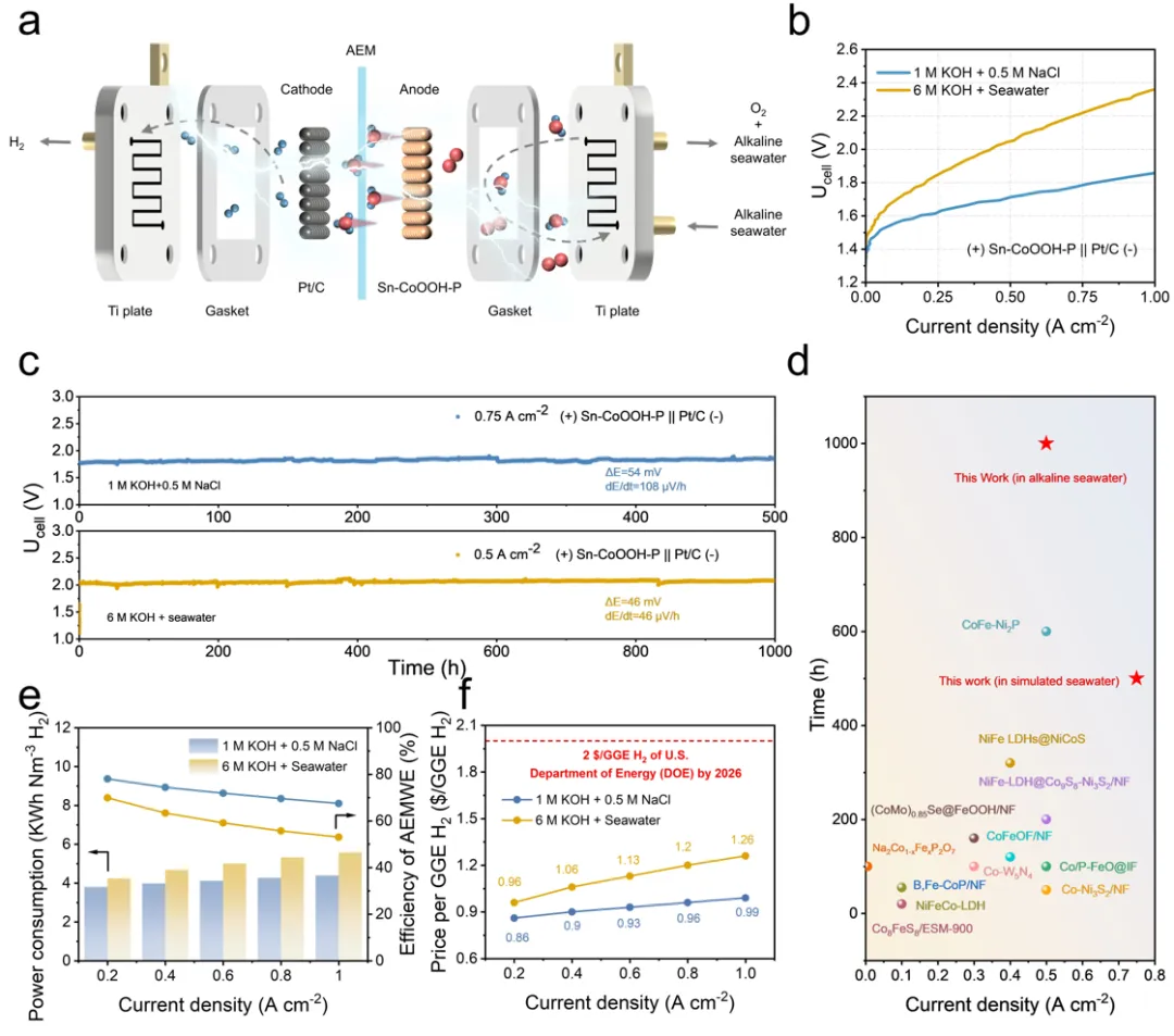 为进一步评估Sn-CoOOH-P作为阳极催化剂在大电流密度下的实际应用前景,我们将其集成到膜电极中并组装了碱性阴离子交换膜电解槽(AEM)。该电解槽在碱性模拟海水与碱性天然海水中分别仅需1.713 V与2.053 V的槽压即可达到500 mA cm-2的电流密度。更重要的是,该电解槽在模拟海水中于750 mA cm-2的电流密度下稳定运行500 h,在碱性天然海水中以500 mA cm-2的电流密度稳定运行1000 h,电压仅分别上升54 mV与46 mV,表现出优异的催化稳定性。此外,我们进一步计算了电解槽在不同电流密度下的能耗与电解效率。结果表明,即使在1 A cm-2的大电流密度下,组装的电解槽在模拟海水与碱性天然海水中的运行效率仍分别达到约67.5%与53.0%,制氢能耗仅为4.39与5.58 KWh Nm-3 H2。经济性分析表明,每单位汽油加仑当量氢气的生产成本可低至0.86美元(最高1.26美元),低于美国能源部2026年目标(2.00美元)。