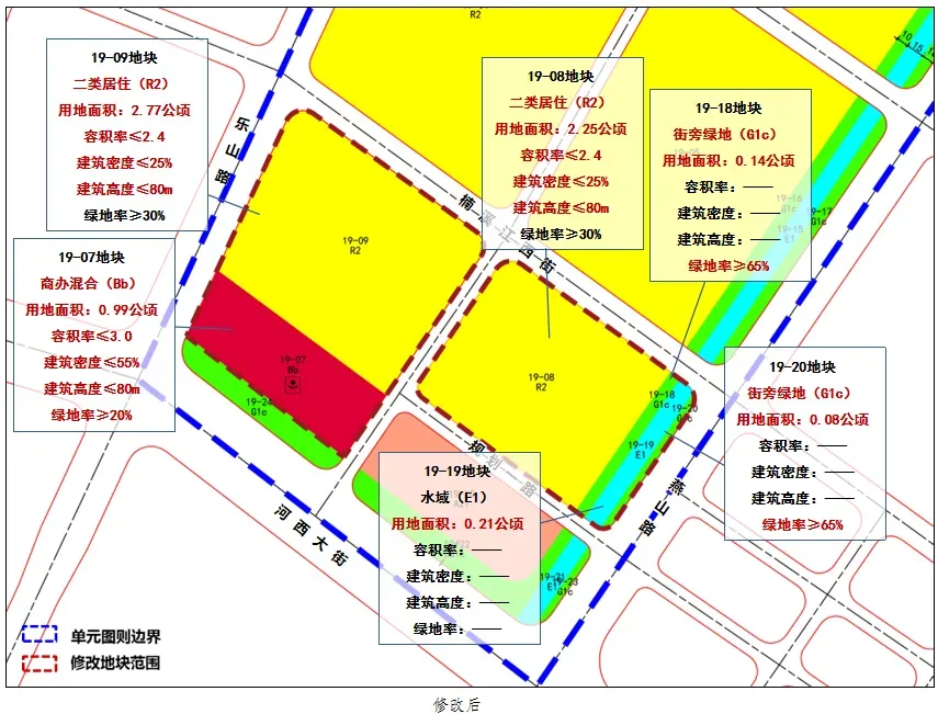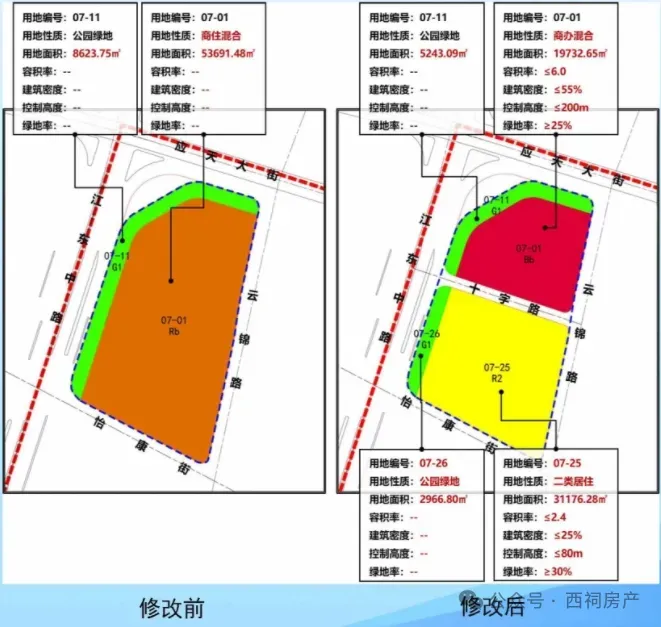 合并后,该地块为二类居住用地,容积率≤2.4,建筑密度≤27.5%,建筑高度≤80米,绿地率≥30%。