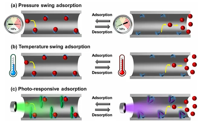 图 1 变压吸附、变温吸附与光响应吸附的对比。在变压吸附和变温吸附过程中,解吸步骤需通过降压或升温实现,这两个步骤均能耗较高;而在光响应吸附过程中,解吸步骤仅需光照即可完成,是一种更节能的替代方案。