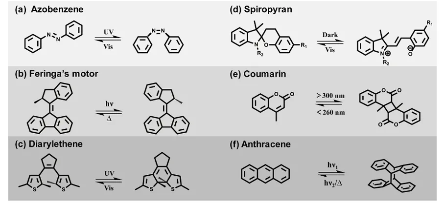 图 2 常见的光响应官能团及其响应机制,分别为偶氮苯、费林加分子马达、二芳基乙烯、螺吡喃、香豆素和蒽。