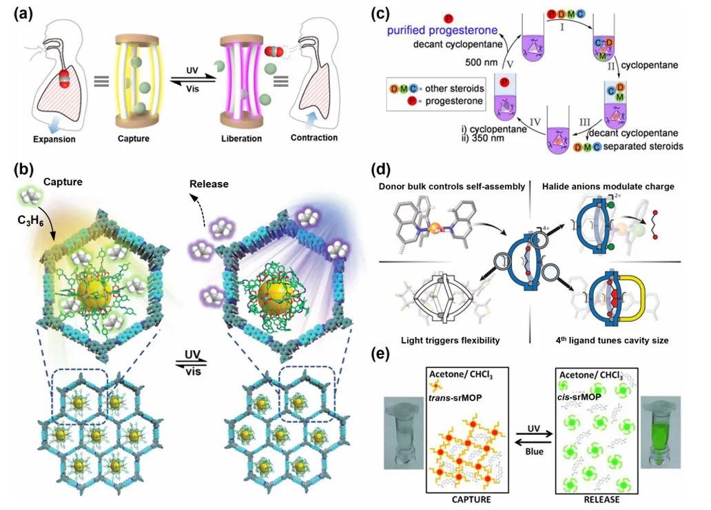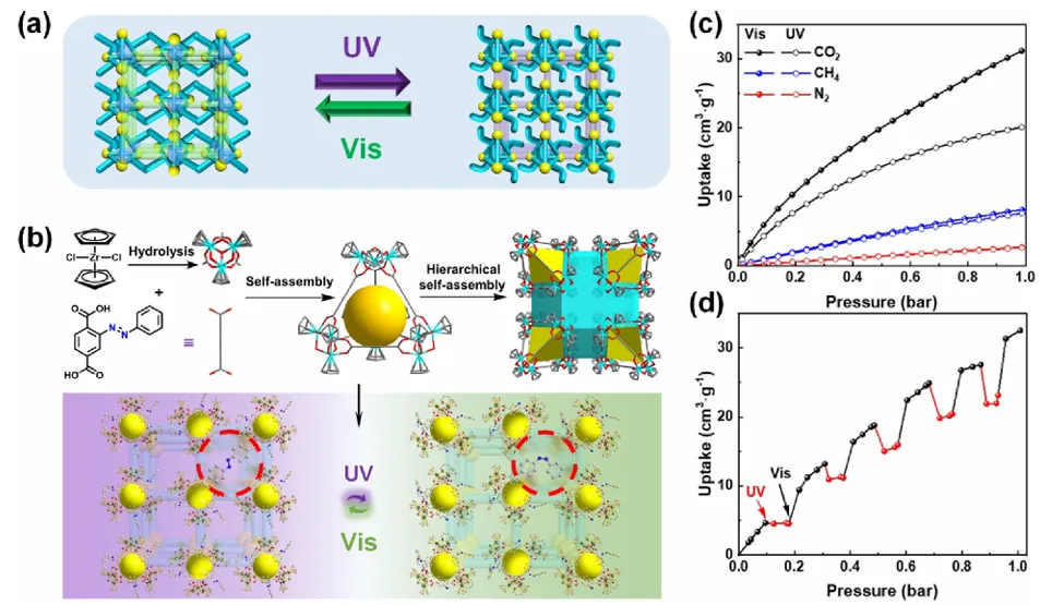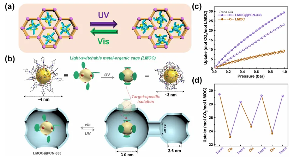 吸附分离广泛应用于化工等行业,该技术需通过变温或变压方式调控吸附容量,然而变温与变压过程的能耗较高,因此开发超越传统吸附容量调控方式的新方法迫在眉睫。受自然界启发,光响应型金属有机笼被设计出来并受到广泛关注,这类材料是可在光照下发生可逆异构化的智能材料,能够通过可逆调控吸附容量,实现按需、节能的吸附分离。