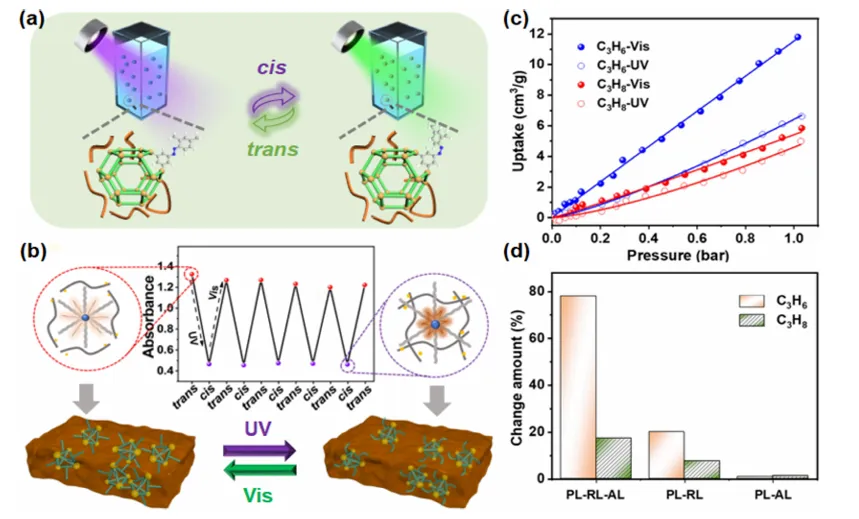 图 6 提升光响应调控效率的构建基于光响应型金属有机笼的光响应多孔液体的策略;通过紫外 / 可见光切换实现 PL-RL-AL 的可逆反式 / 顺式异构化;273K 下,紫外 / 可见光照射下 PL-RL-AL 对丙烯和丙烷的吸附等温线;PL-RL-AL、PL-RL 和PL-AL 对丙烯和丙烷的吸附量变化。