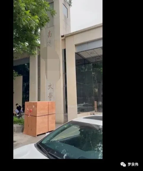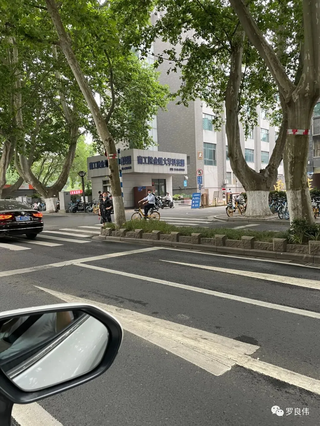 (透过车窗看到对面的高校标志。补拍于2021年6月,我们重返南京)
