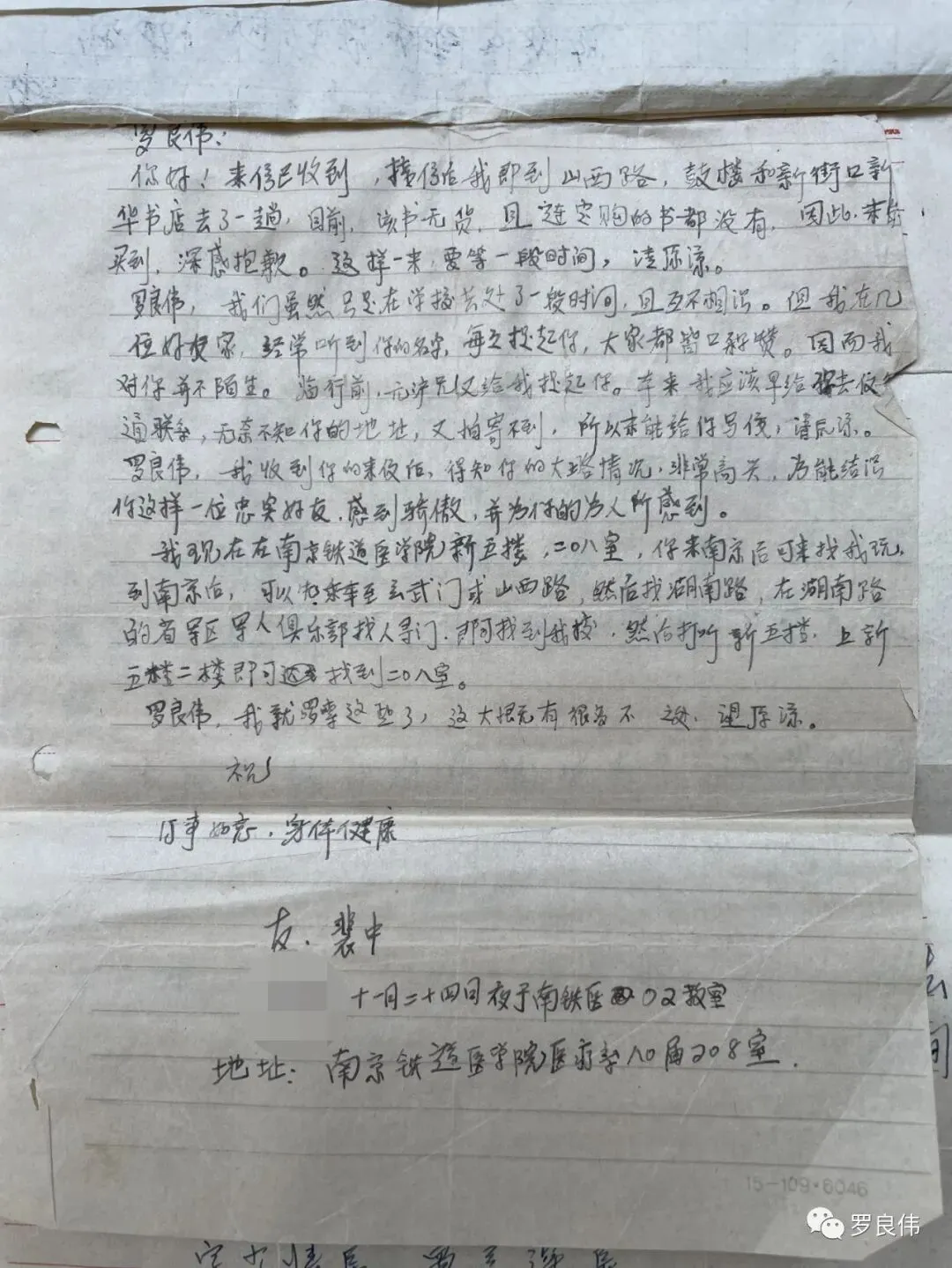 备注:在文中配图的部分信函是当年在南京铁道医学院就读的邓江平、裴中学友的,当时与他们联系甚密。军校毕业后,虽然没了联系,心中却时常挂念。四十年过去,这两位学友应该成了一代名医和大师了;当年在南京铁道医学院就读的高中同学许红,虽然在南京仅见过一面,但印象深刻……。