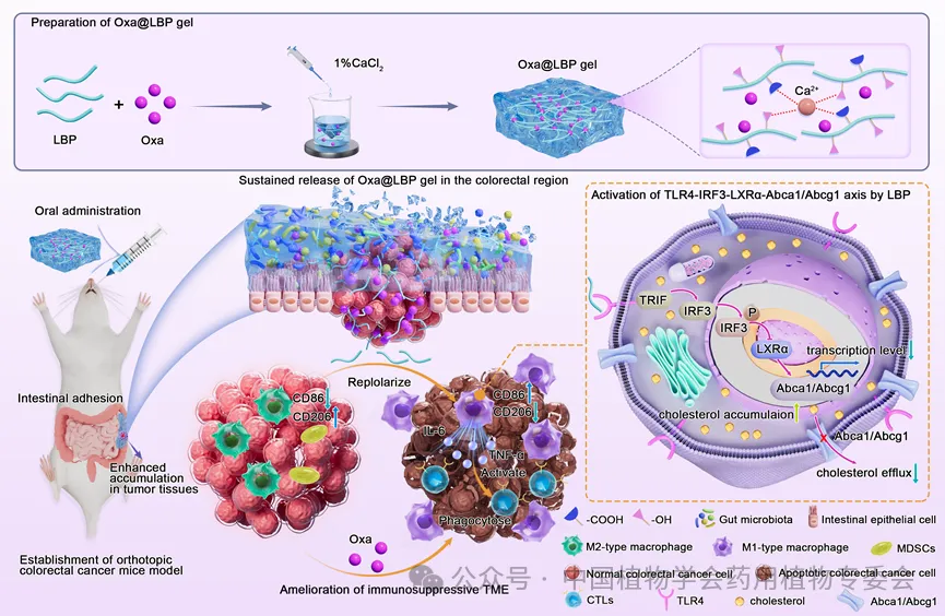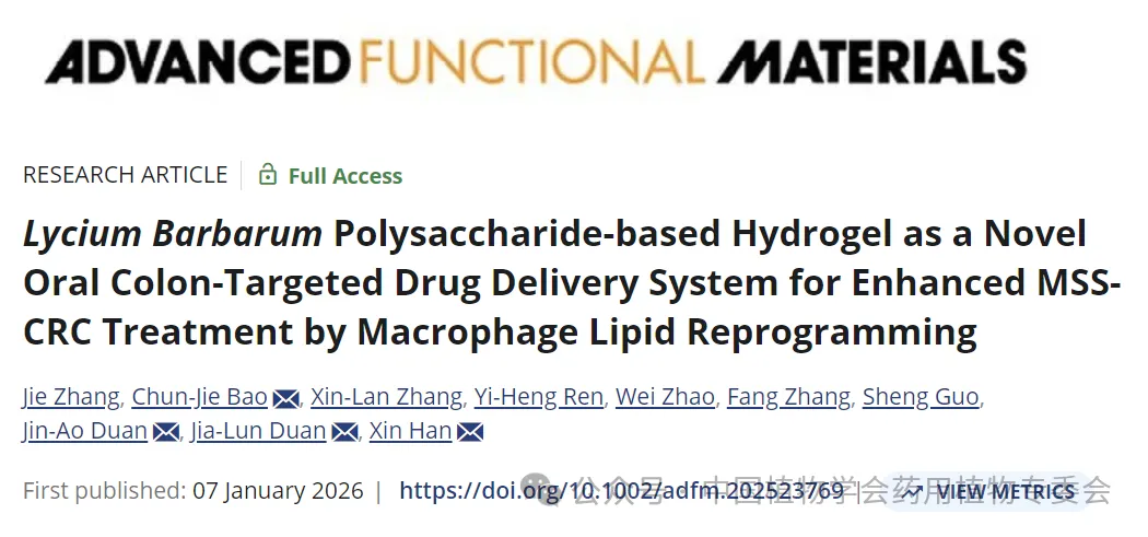 2026年1月7日,南中医段嘉伦、包纯洁、段金廒、韩欣等人在国际学术期刊Advanced Functional Materials(中科院一区,IF:19.0)期刊上在线发表了题为Lycium Barbarum Polysaccharide-based Hydrogel as a Novel Oral Colon-Targeted Drug Delivery System for Enhanced MSS-CRC Treatment by Macrophage Lipid Reprogramming的研究工作。研究创新性地提出以枸杞子多糖作为生物活性基质,构建了一种口服结肠靶向水凝胶递药系统,实现了化疗药物奥沙利铂在结肠部位的可控缓释,增强了药物在肿瘤组织的富集,同时减少了药物进入全身循环,从而显著降低化疗毒副作用。进一步的机制研究表明,枸杞子多糖可通过调控TLR4-IRF3-LXRα-Abca1/Abcg1信号轴,重编程肿瘤相关巨噬细胞的脂质代谢,促进其向M1抗肿瘤表型极化,进而重塑免疫抑制性肿瘤微环境,增强化疗敏感性。该工作为基于大分子多糖类物质开发兼具生物学功能与递药能力的新型生物材料提供了新范式,也为结直肠癌化疗的“增效减毒”提供了具有高转化潜力的新策略。