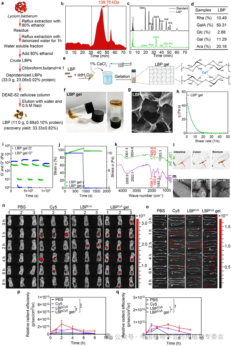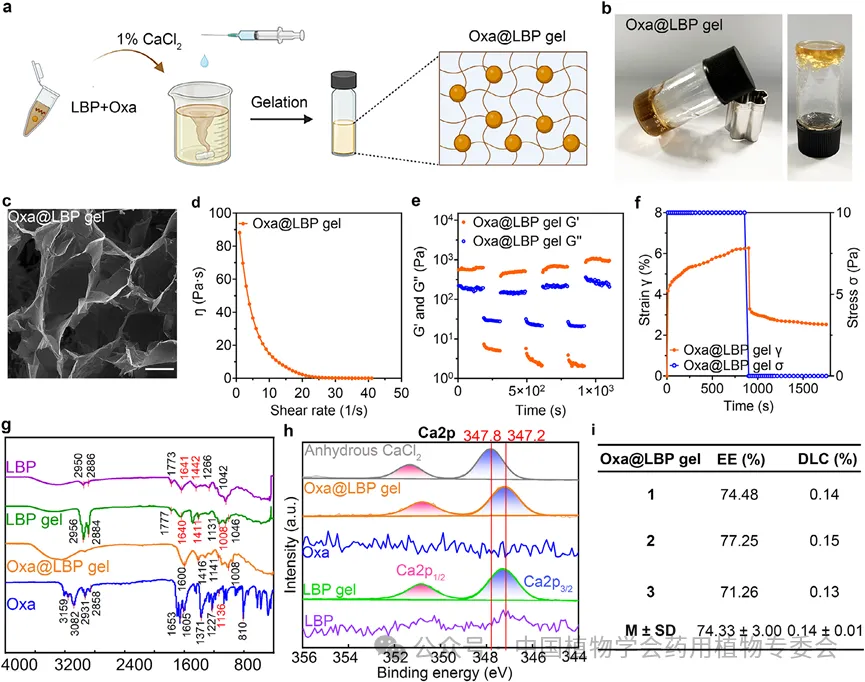 本研究按照前期建立的提取方法,从枸杞子中分离纯化得到一种均一的枸杞多糖(LBP)并对其分子量、单糖组成进行鉴定,发现分离纯化得到的LBP平均分子量为139.75kDa,且富含半乳糖醛酸。继而研究者基于半乳糖醛酸与钙离子交联的原理,构建了具有三维多孔网络结构的枸杞多糖水凝胶(LBP gel)。该凝胶展现出优异的流变学特性和强大的肠道黏附能力。随后,研究者将一线化疗药物奥沙利铂(Oxa)装载入凝胶中,成功制备了枸杞多糖载奥沙利铂凝胶(Oxa@LBP gel)。系统表征证实,Oxa@LBP gel与LBP gel具有相似的理化性质(图1-2)。