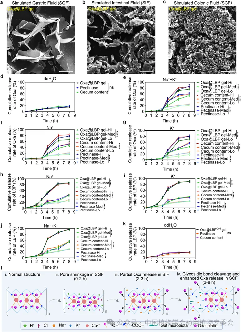 为了揭示Oxa和LBP从Oxa@LBP gel中在消化道中的释放情况,研究通过电镜及体外释放实验具体阐明了Oxa@LBP gel的释药机理:在胃中,Oxa@LBP gel凝胶网络收缩,孔隙率减少,有效地保护Oxa不被胃通过。在小肠中,短时间的离子交换(Na+/K+与Ca2+)仅部分破坏了3D凝胶网络,导致药物从表面多糖链的末端初步释放。在结肠中,长时间的离子交换(Na+/K+与Ca2+)导致大量药物从Oxa@LBP gel中释放。添加果胶酶或盲肠内容物通过断裂凝胶表面的侧链糖苷键来加速Oxa的释放。这种酶作用并没有显著地增加LBP的释放,因为LBP从凝胶骨架中脱离还需要Na+/K+与Ca2+发生完全的离子交换(图3)。