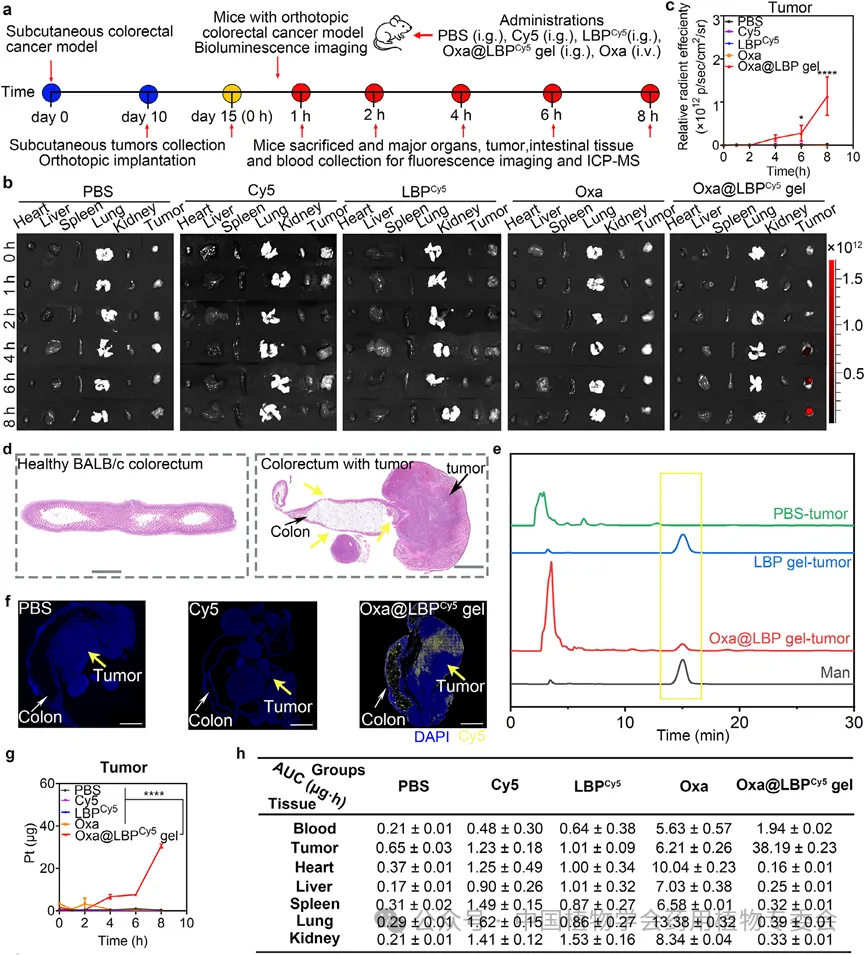 为验证Oxa@LBP gel的结肠靶向与富集能力,研究团队在原位结肠癌小鼠模型中开展了系统的体内分布研究。活体荧光成像显示,LBP能特异性蓄积于结肠肿瘤区域。组织病理学分析(H&E染色)表明,肿瘤组织伴有肠壁变薄及间质增宽,该结构可能有利于LBP凝胶的渗透与滞留。通过高效液相色谱定量检测肿瘤组织中LBP特征性组分甘露糖的含量,发现Oxa@LBP gel组与LBP gel组肿瘤内LBP含量分别为163.59±88.13 µg/g与187.1±64.62 µg/g,进一步通过免疫荧光染色直观证实LBP在肿瘤部位的富集。此外,采用ICP-MS检测组织铂元素分布发现,口服Oxa@LBP gel可显著提高肿瘤局部的药物蓄积:与游离Oxa组相比,肿瘤组织中铂的AUC值由6.21±0.26 μg提升至38.19±0.23 μg,增幅约6倍(图4),清晰表明该递药系统具有优异的肿瘤靶向性与富集能力。