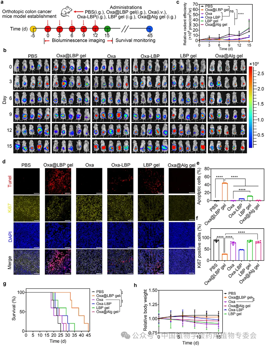 为评估Oxa@LBP gel在体内的抗肿瘤疗效,研究团队在CT26-luc原位结直肠癌小鼠模型中进行了治疗实验。经过5次口服给药后,Oxa@LBP gel治疗组表现出显著的肿瘤生长抑制与生存期延长,效果优于游离Oxa组及海藻酸钠载药凝胶对照组。TUNEL与Ki67染色进一步证实,该组肿瘤细胞凋亡增加、增殖受到明显抑制(图5)。