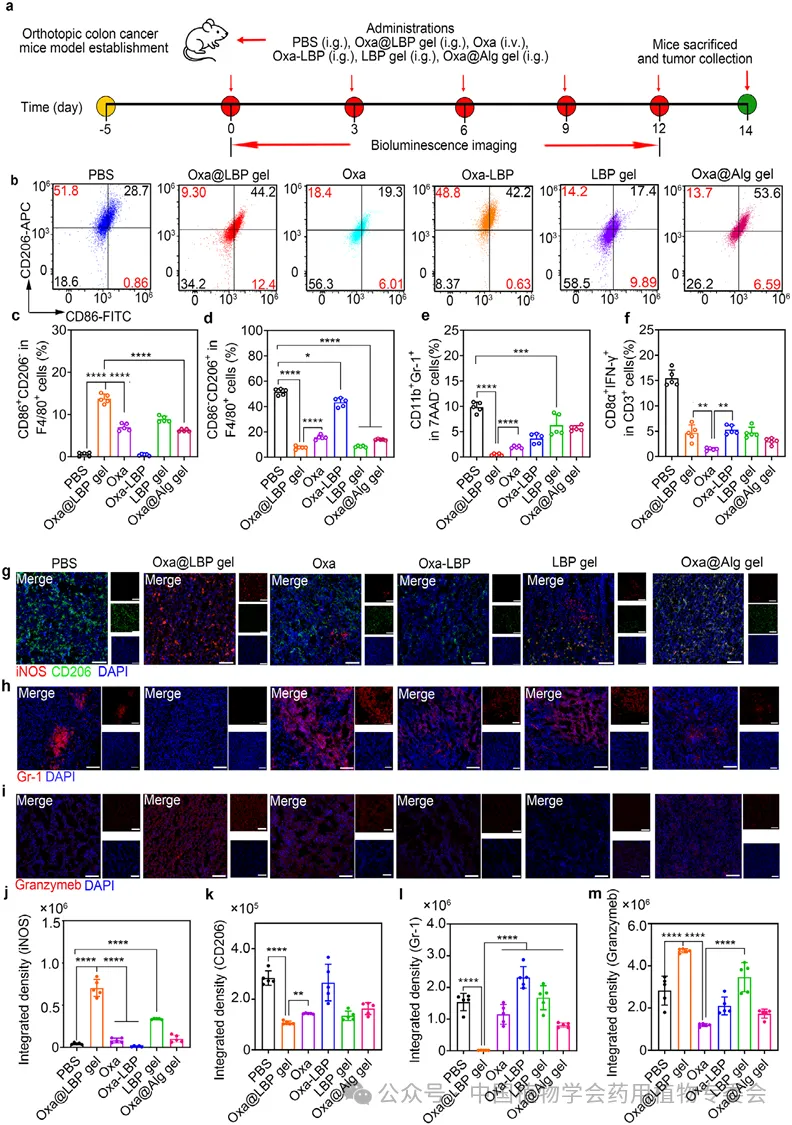 为探究该凝胶系统对肿瘤免疫微环境的影响,研究通过流式细胞术分析了肿瘤浸润巨噬细胞表型。结果显示,Oxa@LBP gel治疗组中促炎M1型巨噬细胞(CD86⁺CD206⁻)比例上升至12.4%,而抑炎M2型(CD206⁺CD86⁻)占比下降至9.30%,表明其能有效推动巨噬细胞向抗肿瘤M1表型复极化。相比之下,海藻酸钠载药凝胶组对巨噬细胞表型调控作用较弱。值得注意的是,单独使用LBP gel也表现出类似的免疫调节能力,提示LBP本身在逆转免疫抑制微环境中具有重要作用。上述结果在免疫荧光染色中也得到一致验证(图6)。