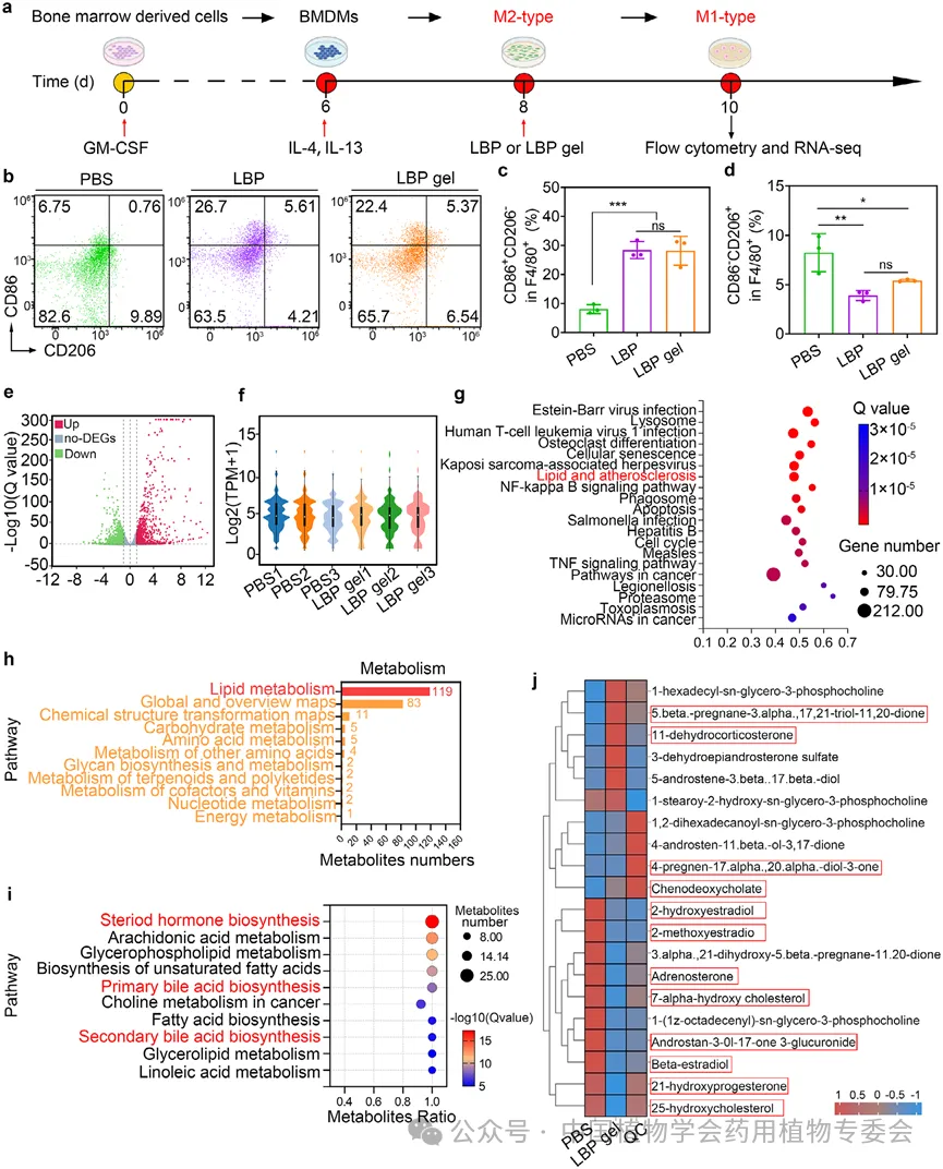 为进一步研究枸杞多糖凝胶促进巨噬细胞复极化的具体机制,研究对LBP gel处理的BMDMs细胞进行了转录组测序。结果表明PBS和LBP gel处理组BMDMs中 lipid and atherosclerosis 信号通路存在103 个差异基因,这提示巨噬细胞复极过程可能伴随着脂代谢的改变。脂质代谢组学分析提示与胆固醇代谢相关的代谢物的表达水平发生了显著变化,表明LBP gel处理的复极化BMDMs的胆固醇代谢发生了变化(图7)。进一步,研究采用脂滴摄取实验,基于流式细胞术及共聚焦技术分别对体内外LBP gel处理的巨噬细胞内脂质水平进行检测,结果表明:LBP gel处理后体内外巨噬细胞均表现为胆固醇蓄积增多(图8)。