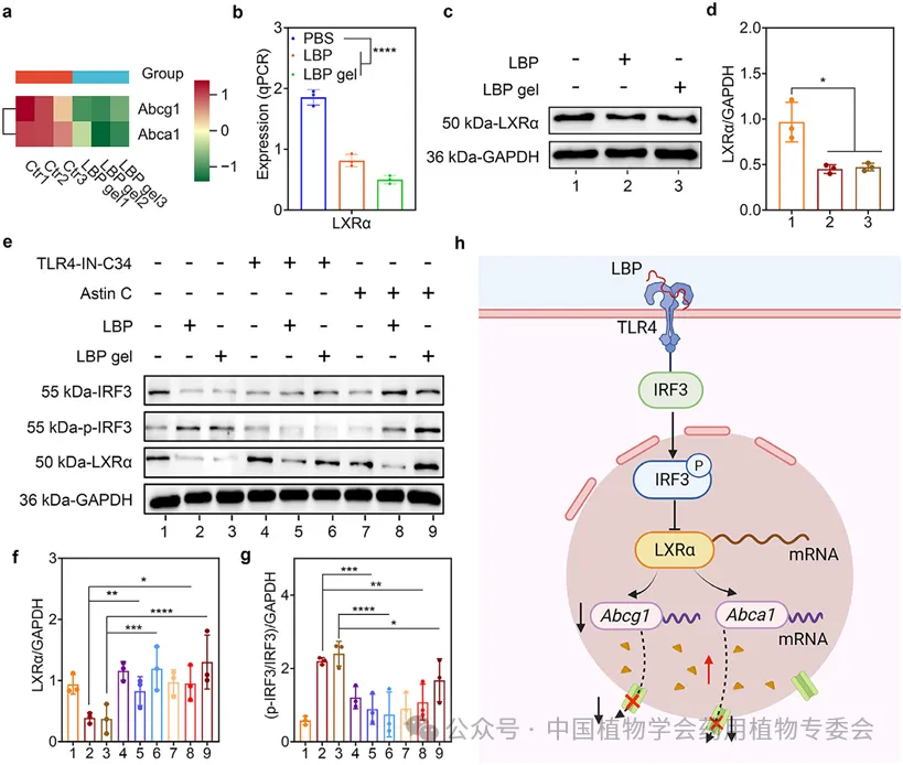 基于LXRα是调控Abca1/Abcg1重要上游因子的已知背景,研究进一步检测发现LBP凝胶能降低LXRα的表达。结合文献中TLR4激活可经IRF3磷酸化抑制LXRα转录的报道,以及LBP已知的TLR4激活能力,研究推测LBP凝胶可能通过TLR4-IRF3轴抑制LXRα,进而下调Abca1/Abcg1。为验证该通路,研究使用TLR4拮抗剂和IRF3抑制剂进行干预。结果显示,阻断TLR4或抑制IRF3磷酸化后,LBP凝胶对LXRα及Abca1/Abcg1的下调作用被取消,从而证实LBP凝胶通过TLR4-IRF3-LXRα信号轴调控胆固醇外流(图9)。