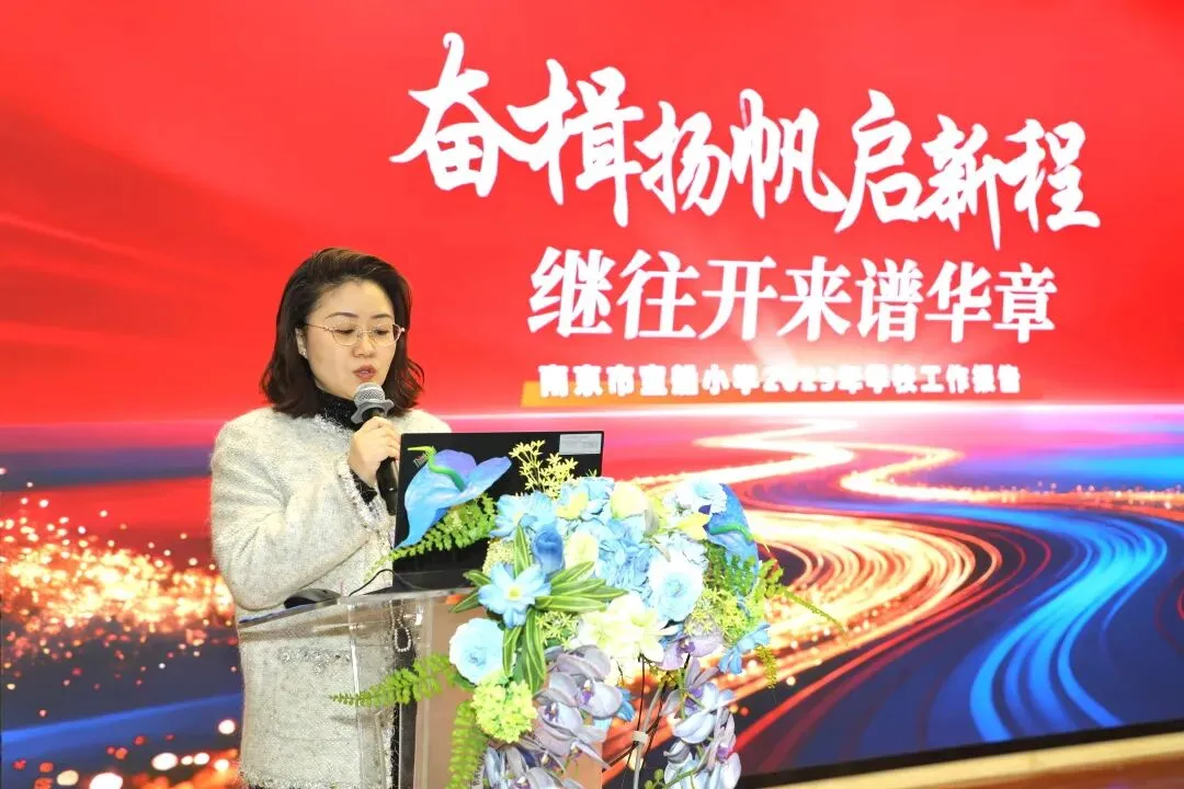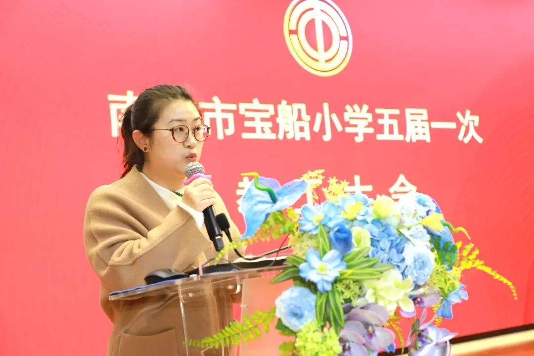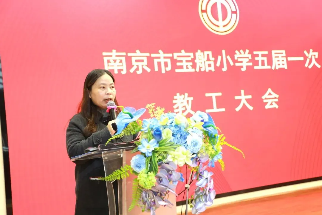 近日,南京市宝船小学期末总结会暨五届一次教工大会,在全体教职工的热切期盼中如期举行。会议由工会主席陈歆芳同志主持,在庄严的国歌声中拉开帷幕,全体教职工精神饱满,会场内暖意融融,气氛庄重而热烈。