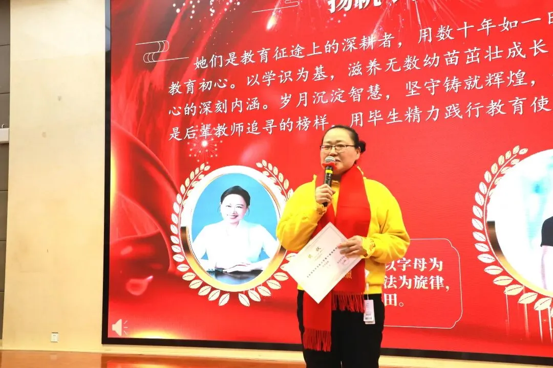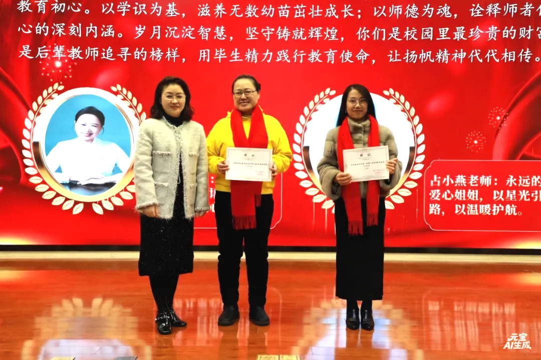 范艳、占小燕两位教师深耕讲台数十载,以一生坚守诠释教育初心,荣获“扬帆・终身成就奖”。周姝校长宣读颁奖词并为她们颁奖,两位老师现场分享育人心得,赢得全场敬意。