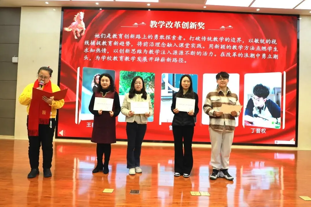 王艳玲、谢源、管艳艳、金华丽、丁晋权五位教师凭借创新的教学理念与实践成果,荣获“教学改革创新奖”。其中,丁晋权老师在江苏省“行知杯”论文竞赛中斩获一等奖,作为最年轻的获奖代表,他还分享了个人专业能力快速成长的感悟与心得。