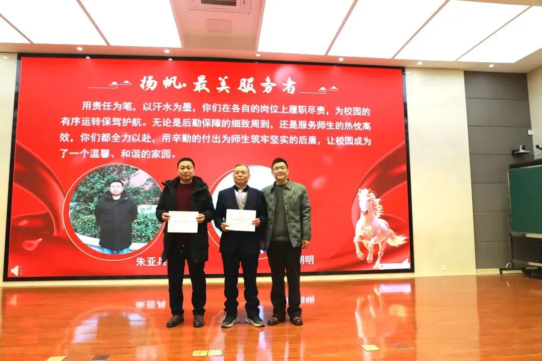 杜朝明、朱亚兵两位校工荣获“扬帆·最美服务者奖”。他们以岗位为阵地,用责任筑牢校园保障线。两位师傅质朴的话语里,饱含着对每一位孩子成长的牵挂与守护。平凡中的深情,赢得了阵阵掌声。
