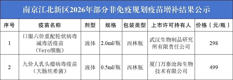 为满足江北新区群众对部分非免疫规划疫苗的接种需求,保障疫苗供应,根据《关于进一步加强全省非免疫规划疫苗采购供应管理工作的通知》(苏疾控〔2025〕12号)、《关于印发江苏省人乳头瘤病毒(HPV)疫苗国家免疫规划工作实施方案的通知》(苏疾控〔2026〕1号)、《南京江北新区非免疫规划疫苗遴选工作实施方案(试行)》及《南京江北新区(浦口)非免疫规划疫苗遴选工作实施方案(试行)》文件要求,南京江北新区疫苗遴选工作委员会、南京江北新区(浦口)疫苗遴选工作委员会于2026年2月11日对部分非免疫规划疫苗进行了增补,现将增补结果予以公示(详见下图)。