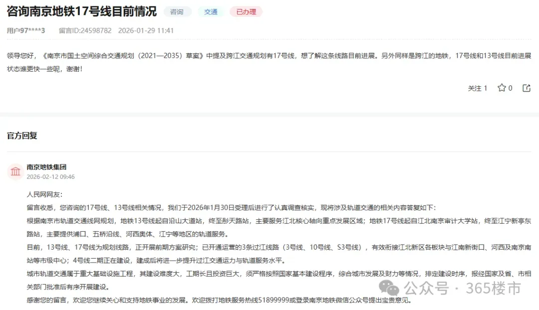 网友问政:《南京市国土空间综合交通规划(2021—2035)草案》中提及跨江交通规划有17号线,想了解这条线路目前进展。另外同样是跨江的地铁,17号线和13号线目前进展状态谁更快一些呢?