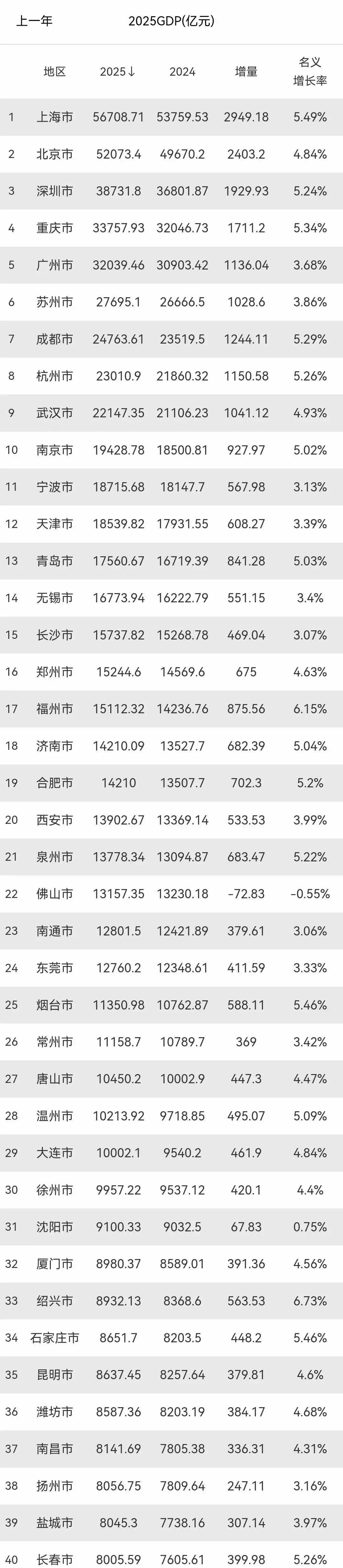 中国城市在经济竞争格局的最新数据中有些现象值得关注,2025年GDP统计下,全国前四十强城市座次变动不小,这种变动不仅仅是总量排序上的事,还牵涉到各城市不一样的经济增长动力和发展阶段,上海和北京依旧牢牢守住头两把交椅,经济总量庞大而且保持稳中有增,深圳这个创新引擎紧跟其后,它跟重庆、广州一道成为前五名的成员,但有意思的看点在于排位中段城市间的激烈竞争,有些城市的位次明显改变,外界因此对各区域经济力量对比产生了新讨论。