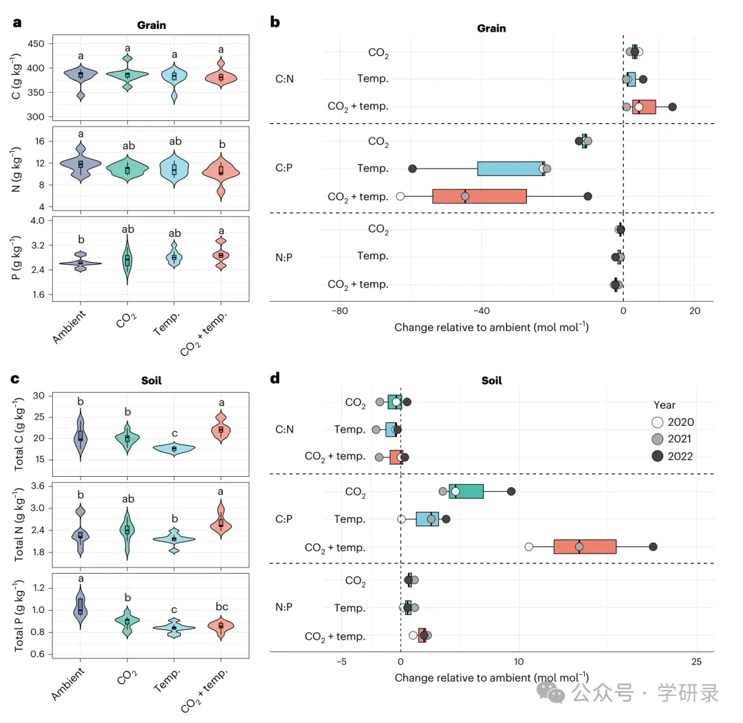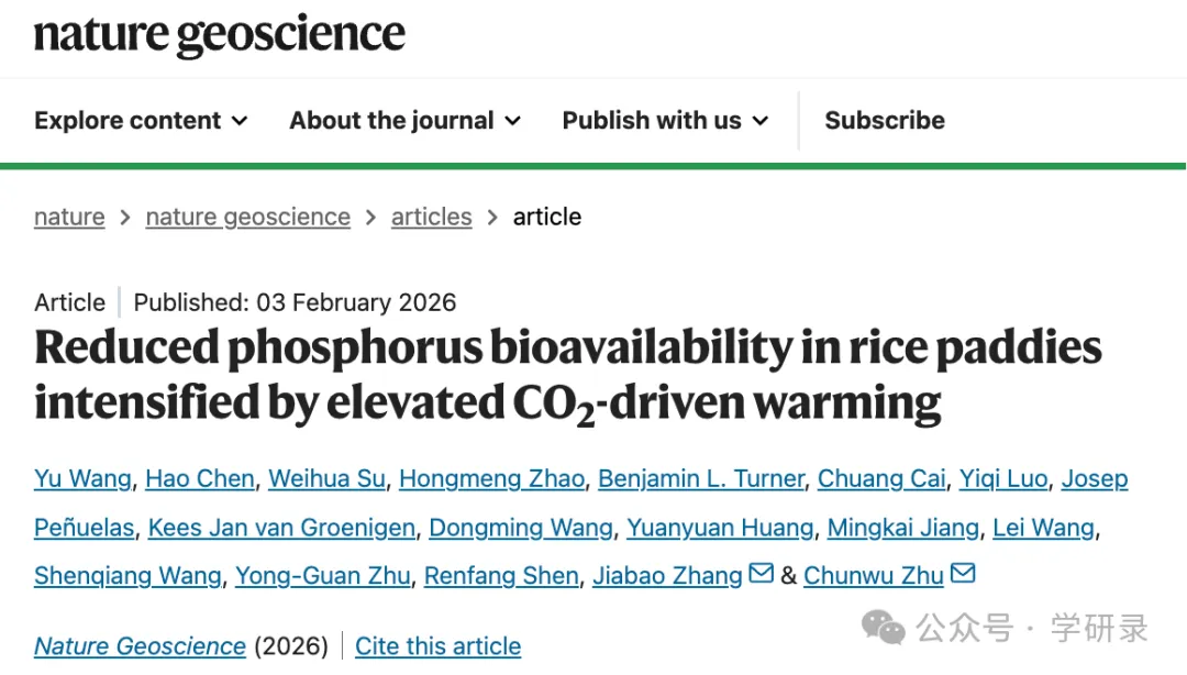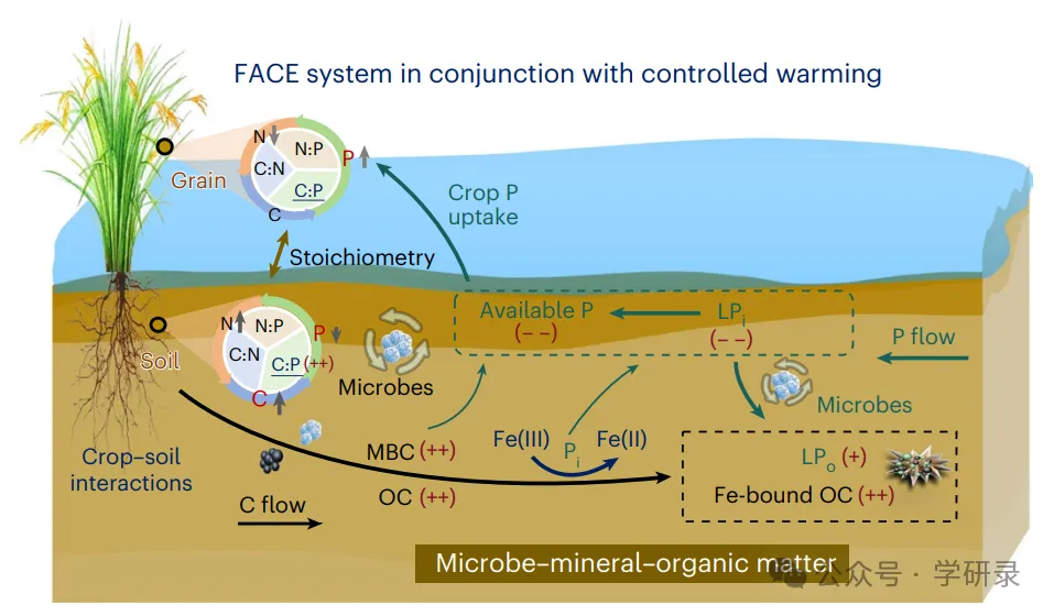 英文题目:Reduced phosphorus bioavailability in rice paddies intensified by elevated CO2-driven warming文章链接:Wang, Y., Chen, H., Su, W. et al. Reduced phosphorus bioavailability in rice paddies intensified by elevated CO2-driven warming. Nat. Geosci. (2026). https://doi.org/10.1038/s41561-026-01917-2大气CO₂浓度升高会通过促进土壤有机磷累积与作物收获移除,降低水稻土的磷(P)有效性。大气CO₂与温度同步上升,但二者对土壤磷循环的交互作用机制仍不明确。本研究依托典型稻-旱轮作系统,开展了长达十年的开放式大气CO₂浓度升高(FACE)与原位增温(+2℃)耦合试验。结果表明,CO₂浓度升高与增温均会加剧土壤磷限制,且单独增温、以及增温与高CO₂协同作用的影响,均显著强于单独CO₂浓度升高。所有气候变化处理均使土壤有效磷大幅耗竭(降幅32%~54%),土壤碳磷比(C:P)显著升高(增幅4%~30%)。此外,增温虽在初期加速磷矿化,但会通过强化铁-有机碳复合物形成与微生物固持作用,最终降低磷有效性;而CO₂浓度升高通过促进作物生长提升其磷需求,上述过程共同加剧了土壤磷耗竭。本研究证实,铁-有机碳互作是此前被忽视、可显著降低磷生物有效性的关键机制。研究结果构建了地上-地下碳磷耦合与微生物驱动的铁-有机质动态关联的理论框架,强调未来气候变化背景下,亟需制定适应性养分管理策略,以保障水稻生产的可持续性。在气候变化背景下,大气二氧化碳浓度升高(eCO2)及其诱导的全球变暖对陆地生态系统的养分循环产生了深远影响。水稻作为全球核心粮食作物,其产量的稳定性高度依赖于土壤养分的供应。磷(P)是限制植物生长的关键大量元素之一,在淹水稻田环境中,磷的有效性受氧化还原电位、pH值及微生物活动的复杂调控。虽然前人研究探讨了单一气候因子对磷循环的影响,但_eCO2与增温共同作用下,水稻土磷有效性的动态响应及其背后的多维调控机制尚不明确。针对研究空白提出了以下核心问题:在长期eCO2和变暖的交互作用下,稻田土壤中的生物有效磷(Bioavailable Phosphorus)含量如何变化?土壤理化性质(如Eh、pH)的变化如何通过非生物途径影响磷的赋存状态?负责磷转化功能的微生物群落(如含有phoD和pqqC基因的类群)在群落结构和功能潜能上发生了哪些关键演变,进而影响磷的生物循环?本研究的逻辑构建遵循了从“现象观测”到“机制解析”再到“系统整合”的科学路径。首先,作者依托于长期FACE实验平台,设置了环境对照(Ambient)、二氧化碳升高(eCO2)、增温(Temp)以及两者并存(eCO2+Temp)四个处理。这种析因实验设计是生态学研究中评估多因子交互作用的标准范式。在非生物环境表征方面,研究重点监测了稻田的关键指标:pH值和氧化还原电位(Eh)。通过原位电极测量,作者获取了分蘖期、抽穗期和灌浆期等关键物候期的动态数据。本文通过长达数年的FACE(大气CO2浓度增高实验)观测发现,eCO2和变暖的叠加效应显著降低了水稻土中磷的生物有效性。图 1:水稻籽粒与土壤中碳、氮、磷含量及化学计量比的时间与气候变异