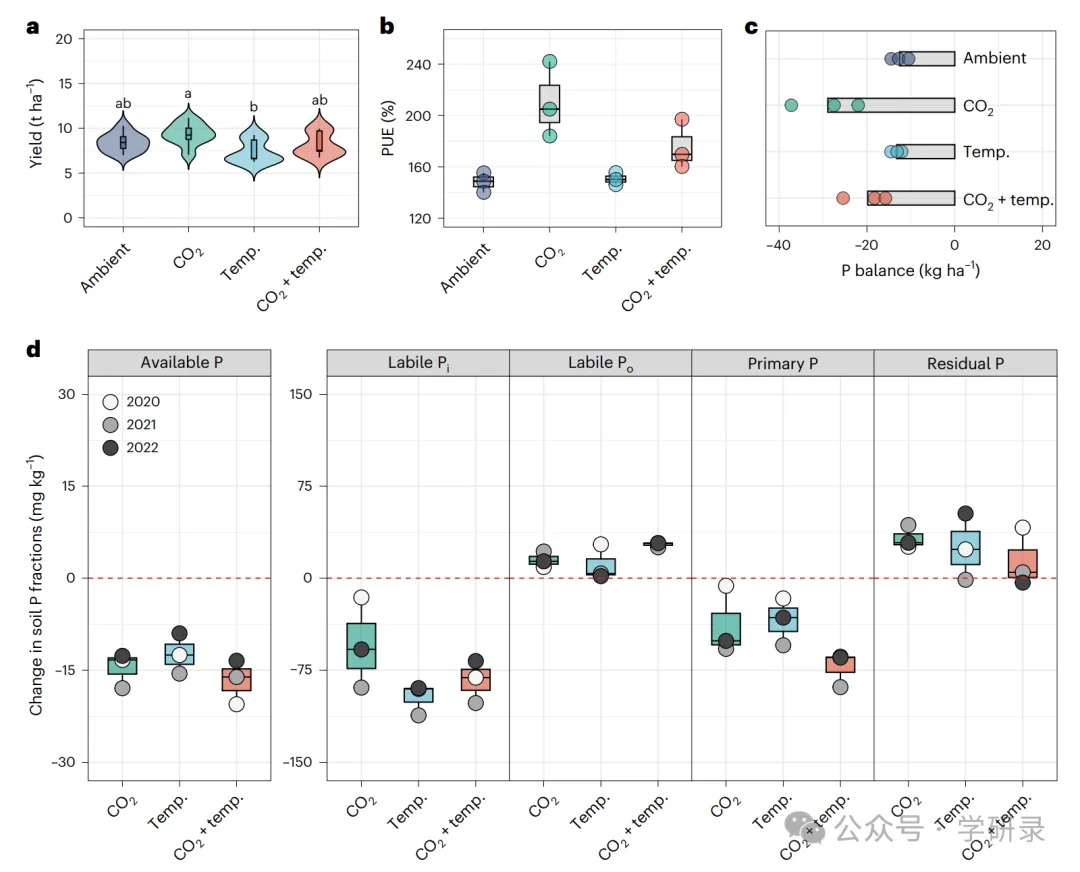 二氧化碳升高与增温共同导致了土壤氧化还原电位(Eh)的显著下降,这种更强的还原环境促进了磷与铁氧化物的结合或沉淀,减少了有效磷的释放。图 2:多年尺度下气候条件对作物及土壤磷动态的影响