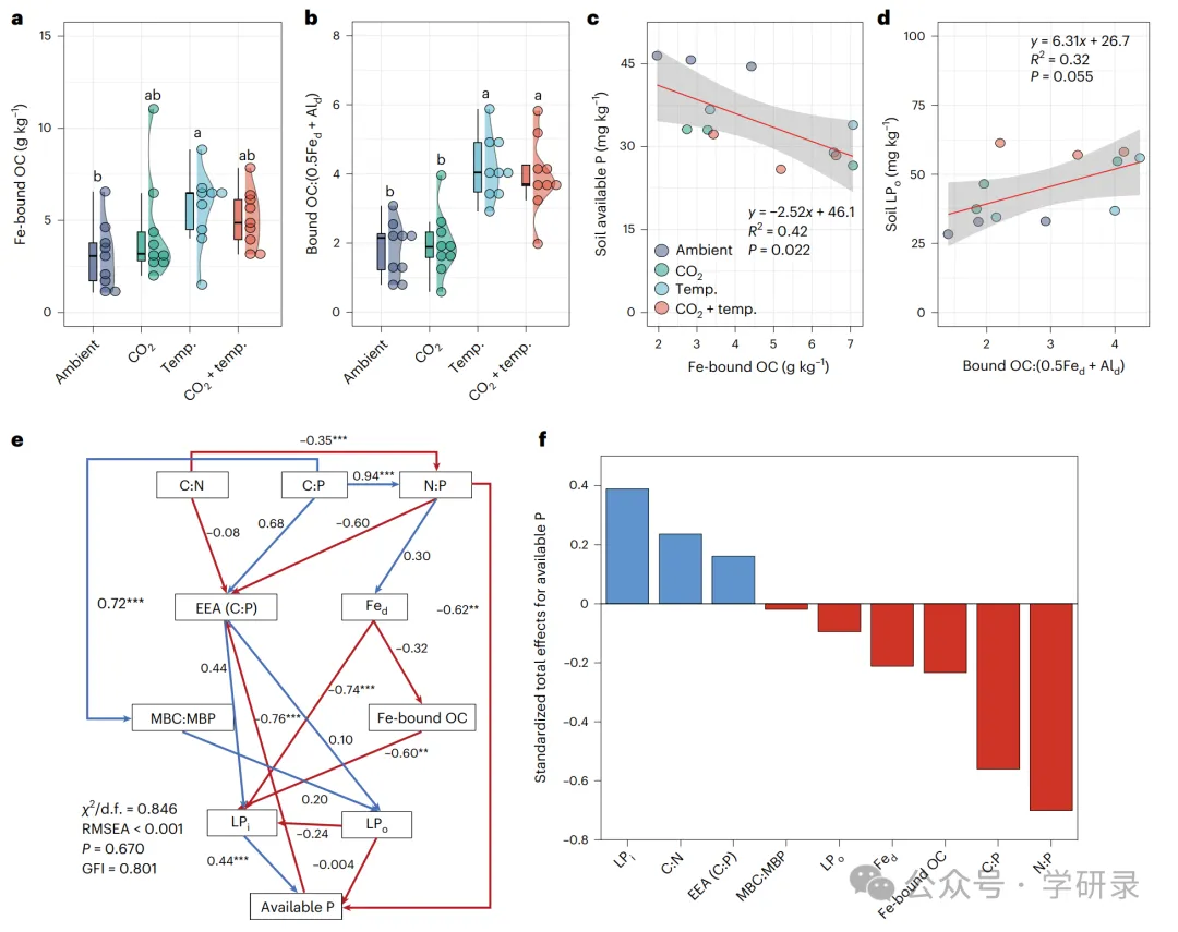 气候变化显著改变了参与磷循环的微生物群落结构。介导有机磷矿化的phoD基因和介导无机磷溶解的pqqC基因的丰度及多样性在复杂气候处理下有所下降,直接削弱了微生物驱动的养分周转能力。图 3:气候对铁结合态有机碳及土壤磷的影响
