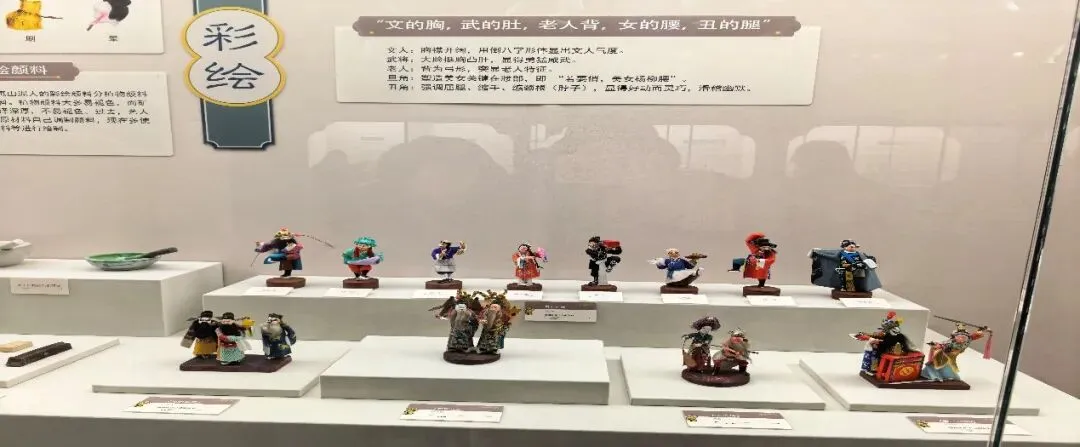 非遗馆中,彩绘泥人栩栩如生。眉眼身姿、胸腹腰腿,每一处捏塑都自有章法;色彩新鲜明快,对比强烈,用笔清爽干净,图纹疏密得当。人物形象大多取自民间故事、神话传说与戏曲小说。一观一赏间,重温了中华传统文化。