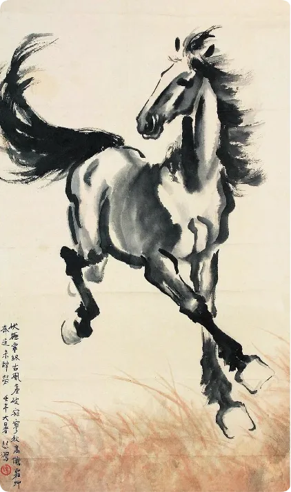 而在画马的艺术长河中,真正一反千年画风,开一代新境的,当属徐悲鸿。旧时画马,多以线描勾勒,重形塑态,而徐悲鸿独辟蹊径,以写意之法画马,饱蘸浓墨,挥毫泼洒,淋漓笔墨间,骏马的英姿跃然纸上。他笔下的马,白额阔鼻,尖耳长腿,鬃毛狂飞如瀑,或驰骋于旷野,四蹄生风;或伫立于荒原,昂首嘶鸣,皆精瘦矫健,傲骨铮铮,将马的精神与人格的崇高融为一体,马的艺术形象,自此成了坚韧、刚毅、不屈的崇高人格象征。