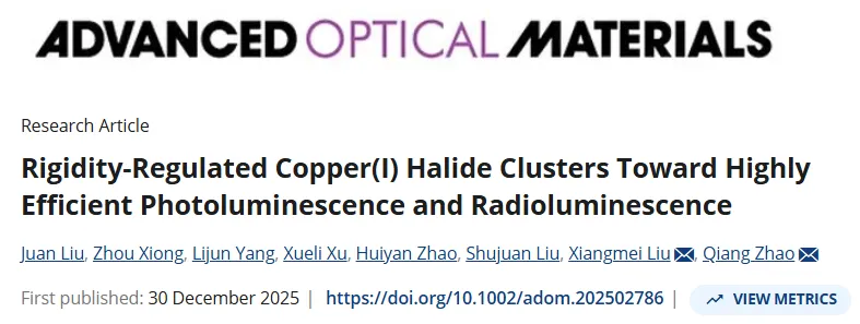 本文通过合成一系列CuxXx(L)2配合物,建立了刚性调控设计策略,系统探究了CuxXx簇基闪烁体的构效关系。M/XLCT 主导的发射受簇核和配体刚性的关键影响,刚性调控可调制簇堆积方式和非辐射衰减路径。Cu2I2(POP)2和Cu2I2(dppb)2表现出高 PLQY 和 X 射线光产额(高达商用 LuAG:Ce 的 150%),这归因于高 X 射线吸收系数与刚性抑制非辐射损失带来的高效激子捕获。通过刮涂法制备的柔性闪烁体薄膜空间分辨率高达 14.0 lp・mm⁻¹。这些发现为开发面向先进 X 射线成像应用的高性能铜(I)卤化物簇基闪烁体提供了宝贵指导。