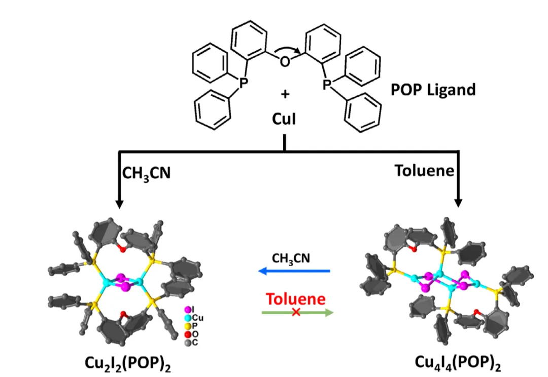 离散簇(如Cu2I2、Cu4I4)通常比一维链、二维层等扩展网络结构具有更强的发光性能,这归因于其更紧凑的结构能抑制非辐射过程。基于配位化学原理,选取半刚性配体 POP 和刚性配体 dppb 构建离散中性CuxIx基化合物:POP 通过强 Cu─P 键螯合CuxIx单元,其──键角可适应特定簇结构;通过慢蒸发法,在不同溶剂中分别制备出Cu2I2(POP)2、Cu4I4(POP)2、Cu2Br2(POP)2、Cu2I2(dppb)2和Cu2Br2(dppb)2单晶。