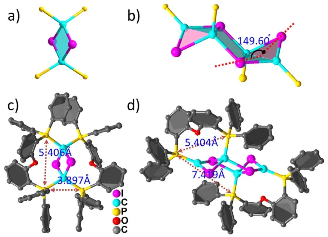 图 2、a)Cu2I2和 b)Cu4I4簇单元的分子结构,以及 c)Cu2I2(POP)2和 d)Cu4I4(POP)2的结构(球棍模型)。
