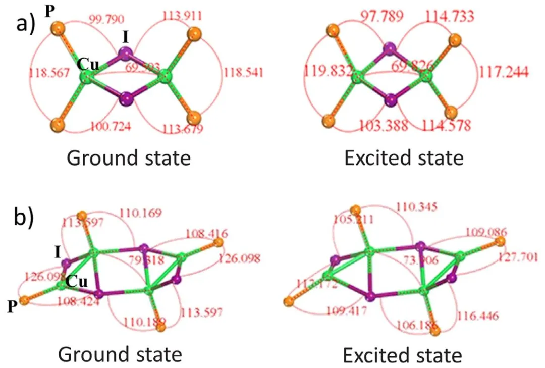 图 4、a)Cu2I2(POP)2和 b)Cu4I4(POP)2在基态(S0)和激发态(S1)下的 DFT 和 TDDFT 优化配位几何结构。