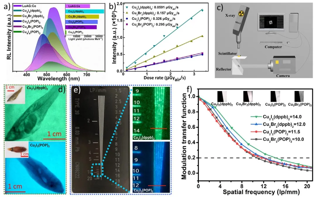 图 5、a)CuxXx(L)2、Cu4I4(POP)2和 LuAG:Ce 的放射发光(RL)光谱及相应光产额;b)RL 强度与 X 射线剂量率的剂量依赖关系;c)自制 X 射线成像系统示意图;d)基于Cu2I2(dppb)2和Cu2I2(POP)2薄膜的干鱼明场照片和 X 射线成像图;e)Cu2I2(dppb)2(上)和Cu2I2(POP)2(下)薄膜的标准分辨率测试板明场照片(左)和 X 射线成像图(右);f)基于CuxXx(POP)2和CuxXx(dppb)2的倾斜边缘法调制传递函数(MTF)测试结果(线卡和样品 X 射线成像的 X 射线光源剂量为 1.122 mGy_air・s⁻¹,采集时间 1 s)。