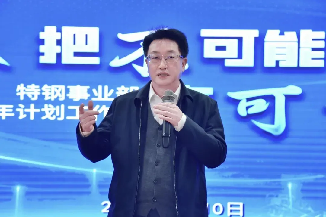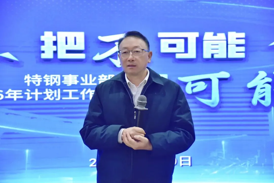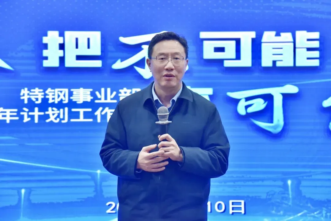 祝瑞荣对特钢事业部2025年取得的成绩给予了肯定,并分析了面临的市场形势,对2026年的工作提出要求: 一、明确特钢的产品定位,坚定实施高端化产品路线,集中资源,实现重点突破,构筑核心优势;二、要运用批判性思维抓好质量工作,把质量攻关列为年度重点专项,针对质量瓶颈进行系统性分析、根源性治理;三、坚持向国内外行业领先企业对标,并制定具体、可衡量、有时限的目标,通过对标找差,向着行业一流目标迈进。四、项目建设要提速增效,各产线既定的改造、新建项目,要全力加快建设进度,坚持工艺创新,积极应用智能化、数字化技术,提升产线的柔性化、智能化水平和生产效率;五、在降本工作上持续开拓思路、挖掘新空间,树立“全价值链成本”观念,激发全员降本智慧。六、营销工作要始终坚持客户导向,攻坚高端市场,深入客户现场,为客户提供高附加值解决方案,不断提升品牌价值和专业服务能力,逐步提升高端市场的份额。