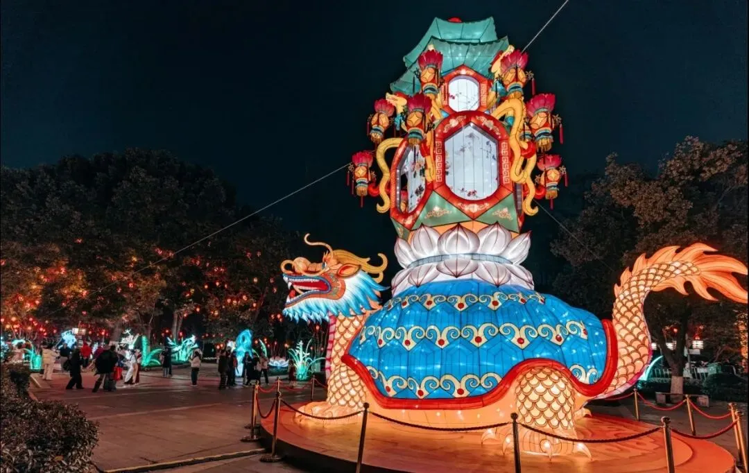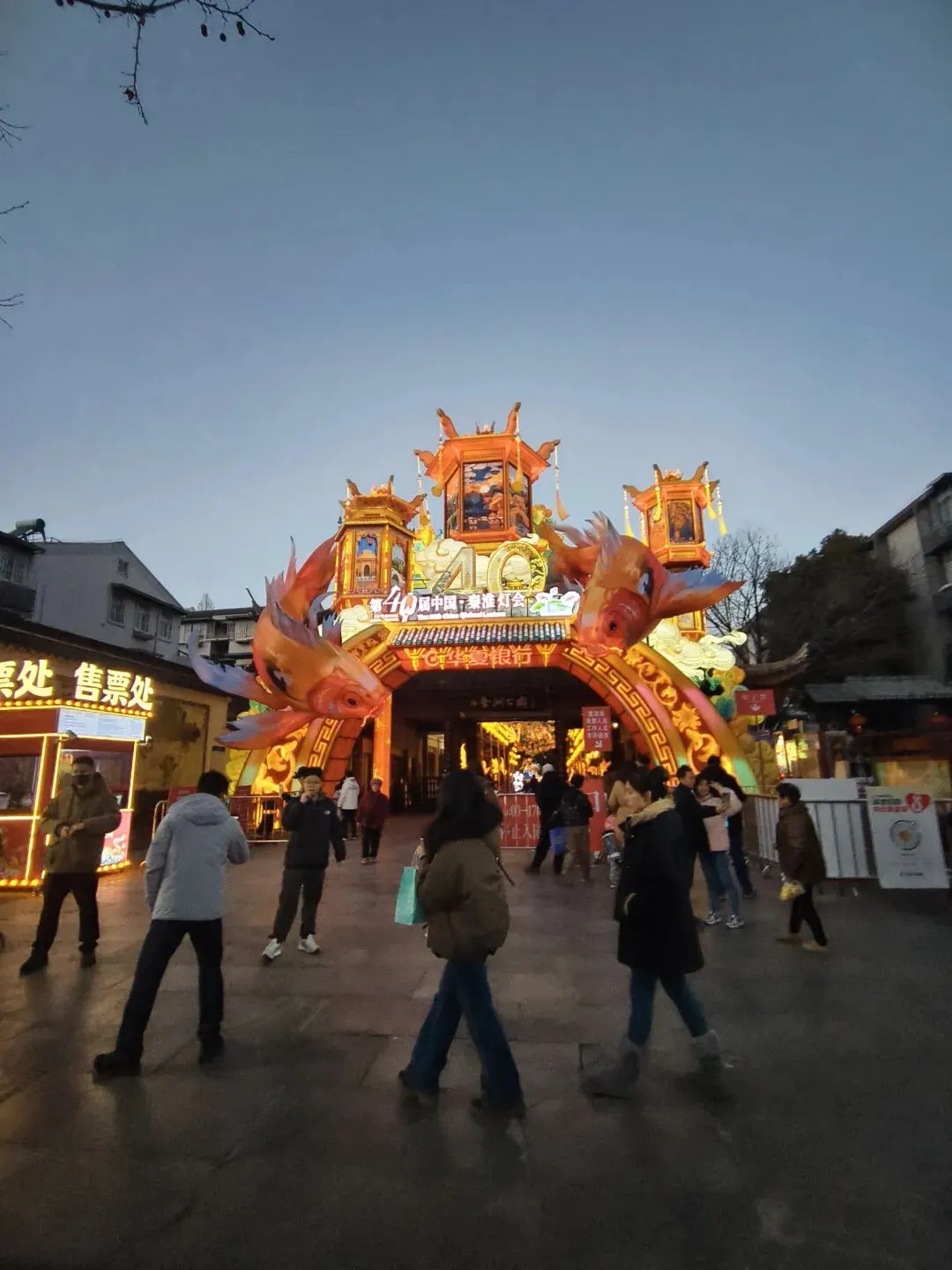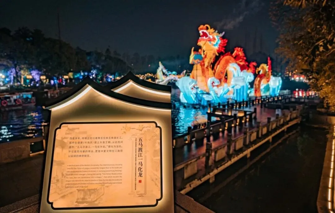 今年灯会的灵魂——60米“五马渡江·一马化龙”灯王,讲的正是西晋末“衣冠南渡”的史诗:五马南渡,一马化龙,中原士族渡江后华夏文脉在金陵薪火相传。设计师说这不是一盏灯,而是一段可以“读”的历史。当龙鳞在喷雾中闪闪发光,我真的站桥上看了很久很久。