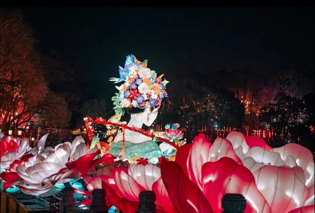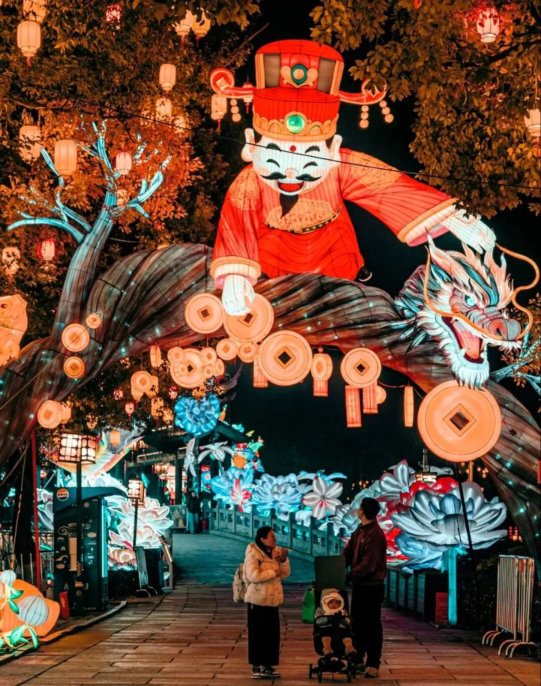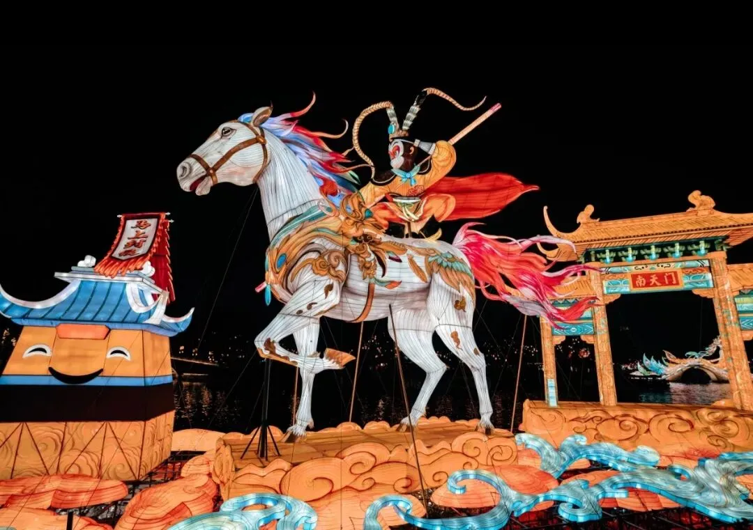公园不大但一步一灯。七大主题区沿水岸铺开,“灯王”卧于浣花桥畔,龙鳞每一片都闪着数万点碎光。“秦淮花神”眼眸含水,灯一亮她真的会眨眼👀!“马上封侯”是大圣策马的飒爽身姿,马年讨个“一飞冲天”好彩头,这里排队合影的人最多。
