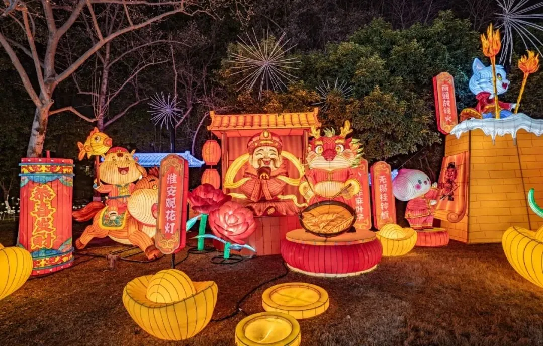 “貔貅进宝”“五福贺岁”能互动,小朋友追着灯组玩疯了。明代风“千灯市集”里糖画摊主现做“马上有福”,年味是甜的呀🍬