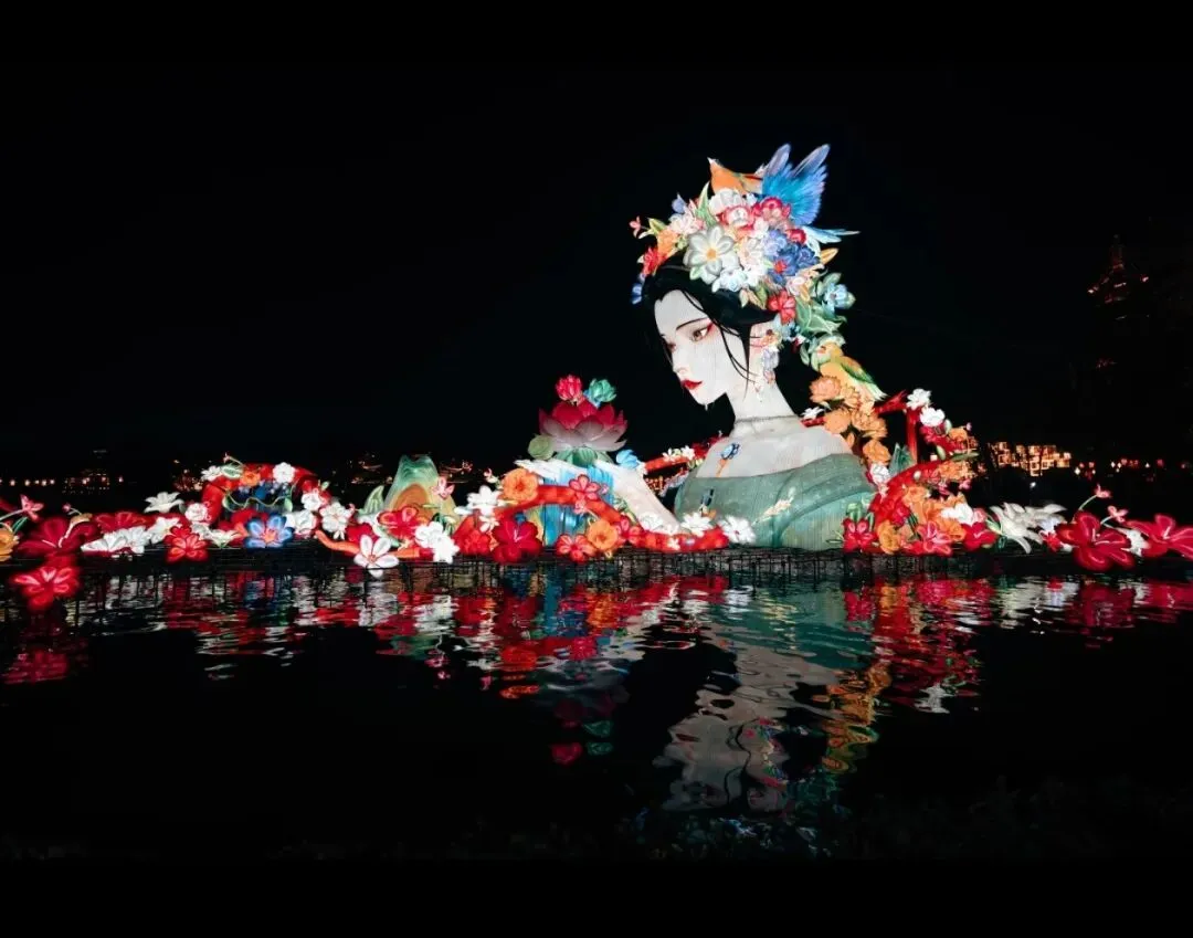 2️⃣ “凤凰女神”站在湖心桥洞前,人在画中走