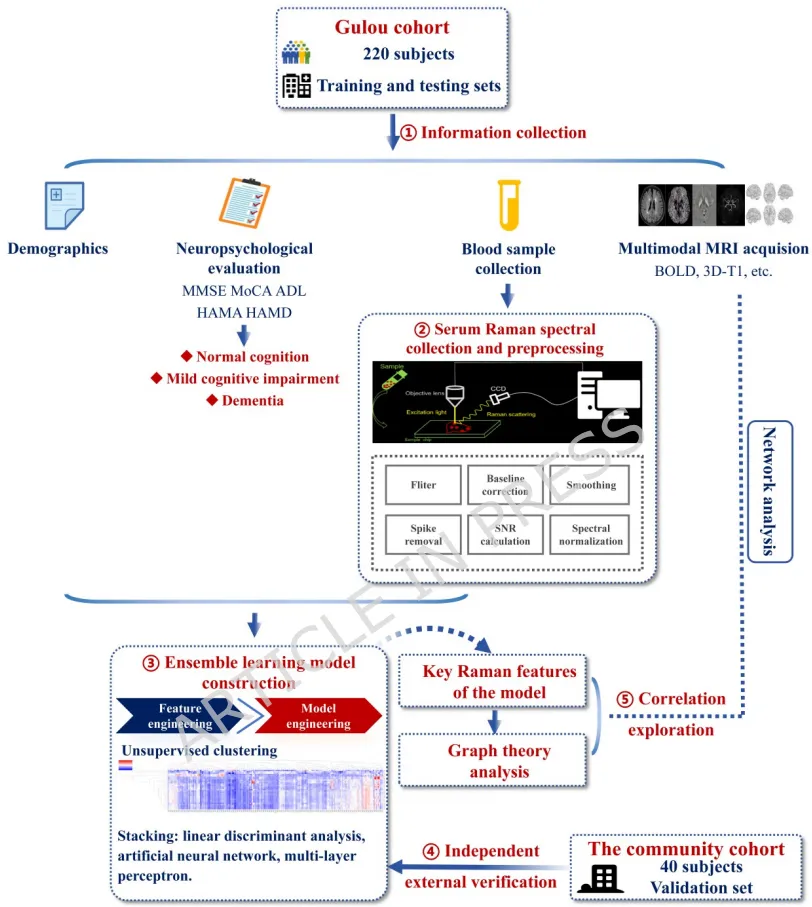 中国正面临人口老龄化加剧,痴呆已成为第五大死因,早期筛查至关重要。当前社区认知筛查依赖神经心理学评估(如MMSE和MoCA),但耗时耗力、可扩展性差。拉曼光谱技术具有操作简便、成本低和接受度高等优势,能通过分子振动检测生物分子变化,但现有模型多限于二分类,缺乏分级评估能力。集成学习结合多种机器学习算法,可提升预测准确性和鲁棒性。本研究旨在开发一种融合拉曼光谱和集成学习的分级认知筛查模型,并探索其与脑网络功能的关联。