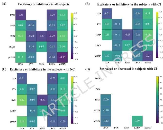 图4. NC与CI组间网络连接差异 图4-a至d显示效应大小,正负值对应兴奋/抑制或增强/减弱。认知障碍组(CI)相比正常认知组(NC),LECN对pDMN的抑制增强(效应值-2.93),DAN对pDMN的兴奋减弱(效应值-1.71)。缩写:DAN,背侧注意网络;PVN,初级视觉网络;SMN,感觉运动网络;LECN,左执行控制网络;pDMN,后默认模式网络。