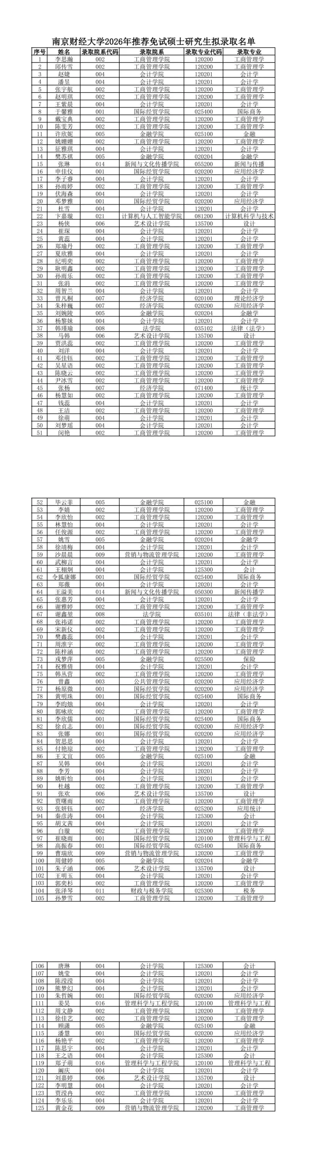 >南京财经大学2026年推荐免试硕士研究生拟录取名单
