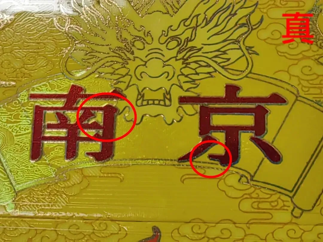 真烟:小盒商标纸“南京”字体底色由多个金色亮点组成且套印准确,“龙”“卷轴”图案线条为金色;